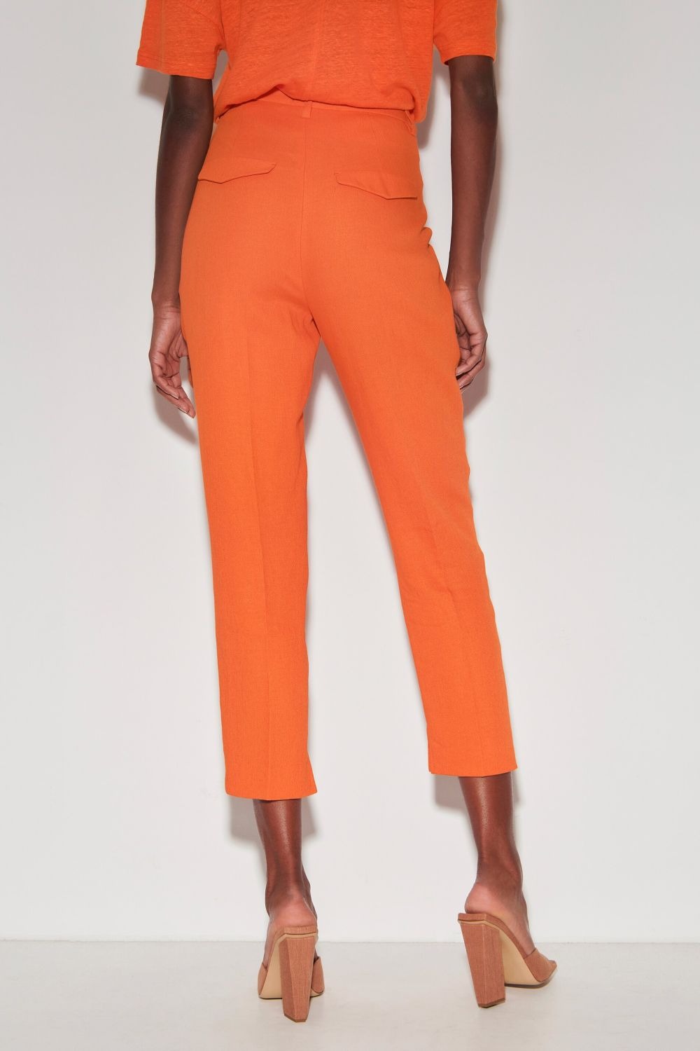 Слегка укороченные брюки из тонкой струящейся смесовой льняной ткани с узкими зауженными брючинами и приглаженными складками. Брюки имеют боковой разрез по низу, два боковых кармана и два декоративных набедренных кармана с клапанами.