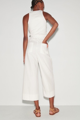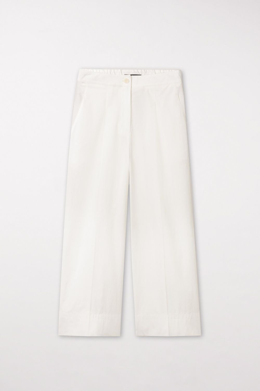 Укороченные широкие брюки из легкого эластичного габардина со складками. Брюки имеют четыре кармана и удобный пояс на частично эластичной резинке.