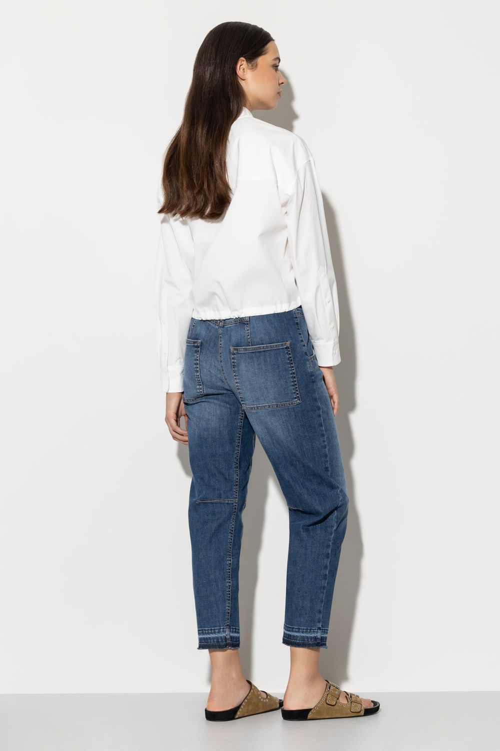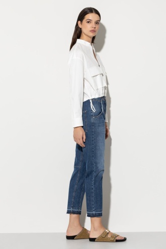 Укороченные джинсы свободного кроя из настоящего эластичного денима с оттенком синего цвета и винтажными эффектами. Слегка изогнутая форма штанин, разделительные швы на высоте колена и открытые края также характеризуют дизайн. Брюки очень удобны в носке благодаря использованию специальной эластомультиэфирной пряжи.