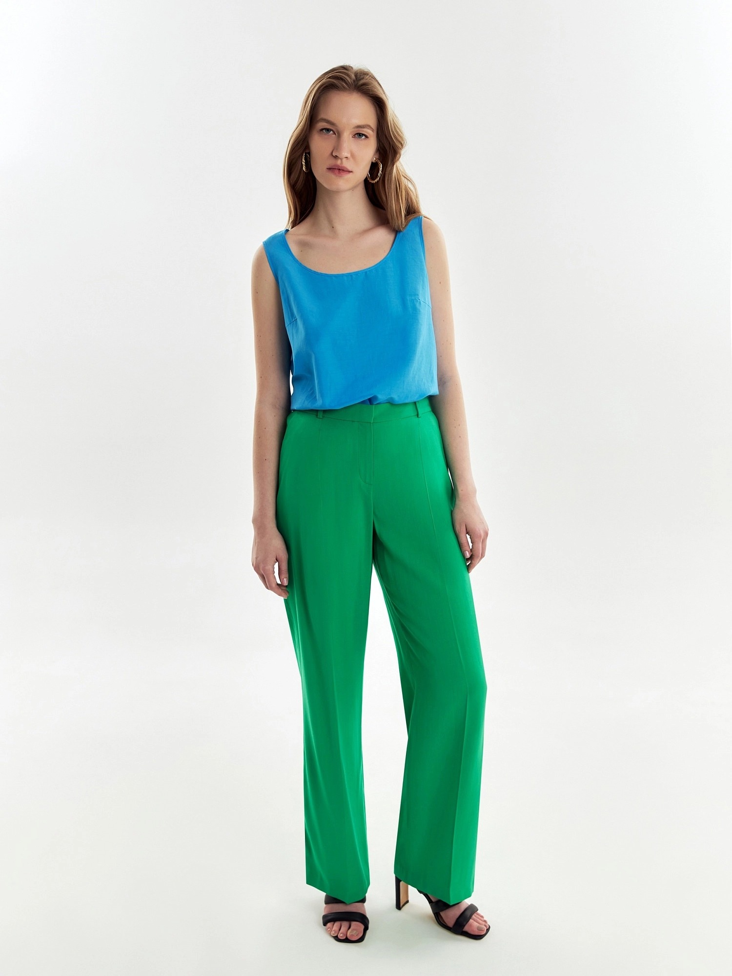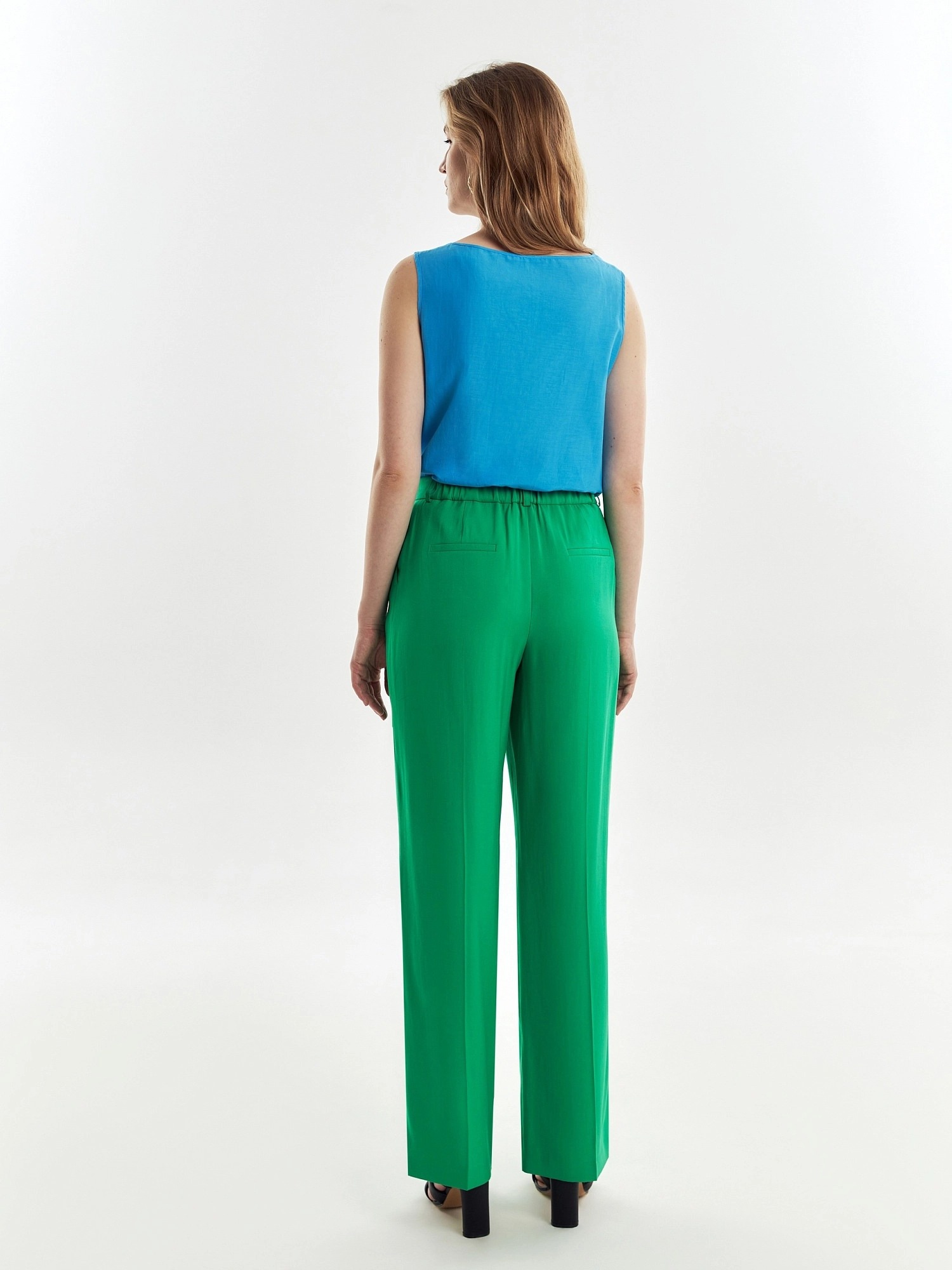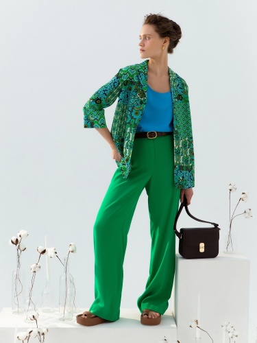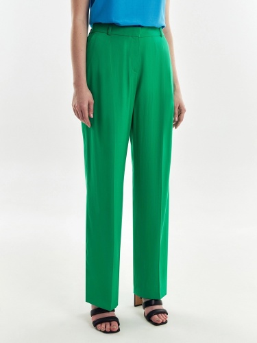 Стильные широкие брюки прямого струящегося силуэта из мягкой костюмной ткани, на притачном поясе с резинкой на спинке и шлевками. Застежка спереди на молнию, пуговицу и крючок. Карманы рабочие в боковых швах.