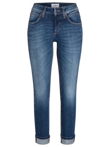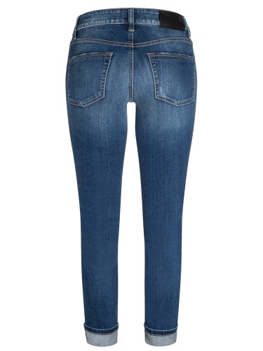 Джинсы с декоративными потертостями и складками. Силуэт slim, высокая посадка, притачной пояс со шлевками, пять карманов.
