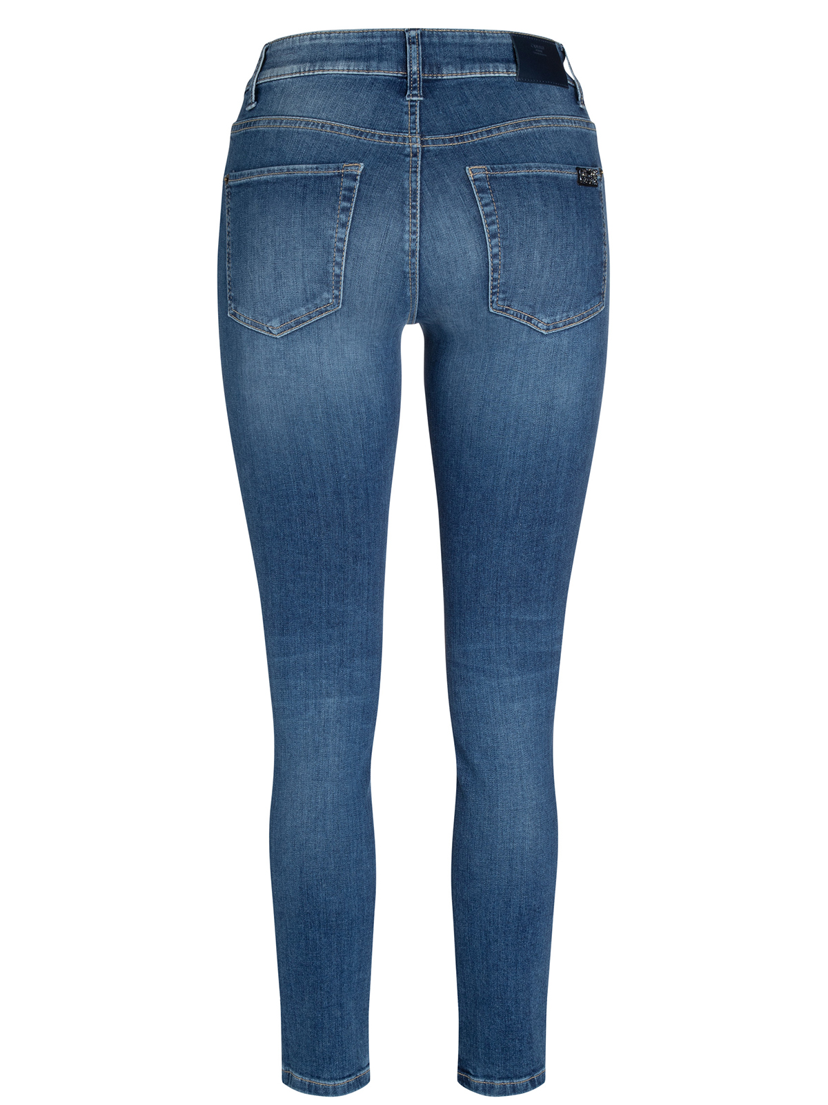 Джинсы с декоративными потертостями и складками. Силуэт slim, высокая посадка, притачной пояс со шлевками, пять карманов.