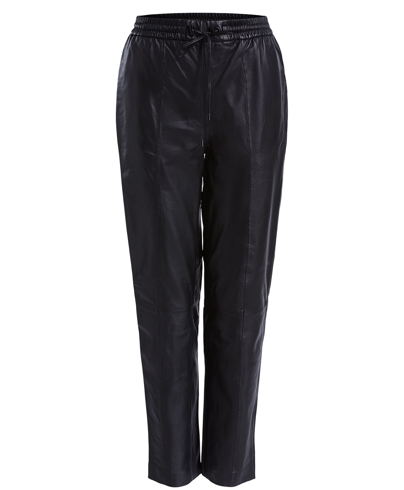 Укороченные брюки из экокожи в спортивном стиле. Эластичный пояс с кулиской обеспечивает комфортную посадку. Прорезные боковые карманы и накладные задние карманы. Шов спереди на штанинах.
