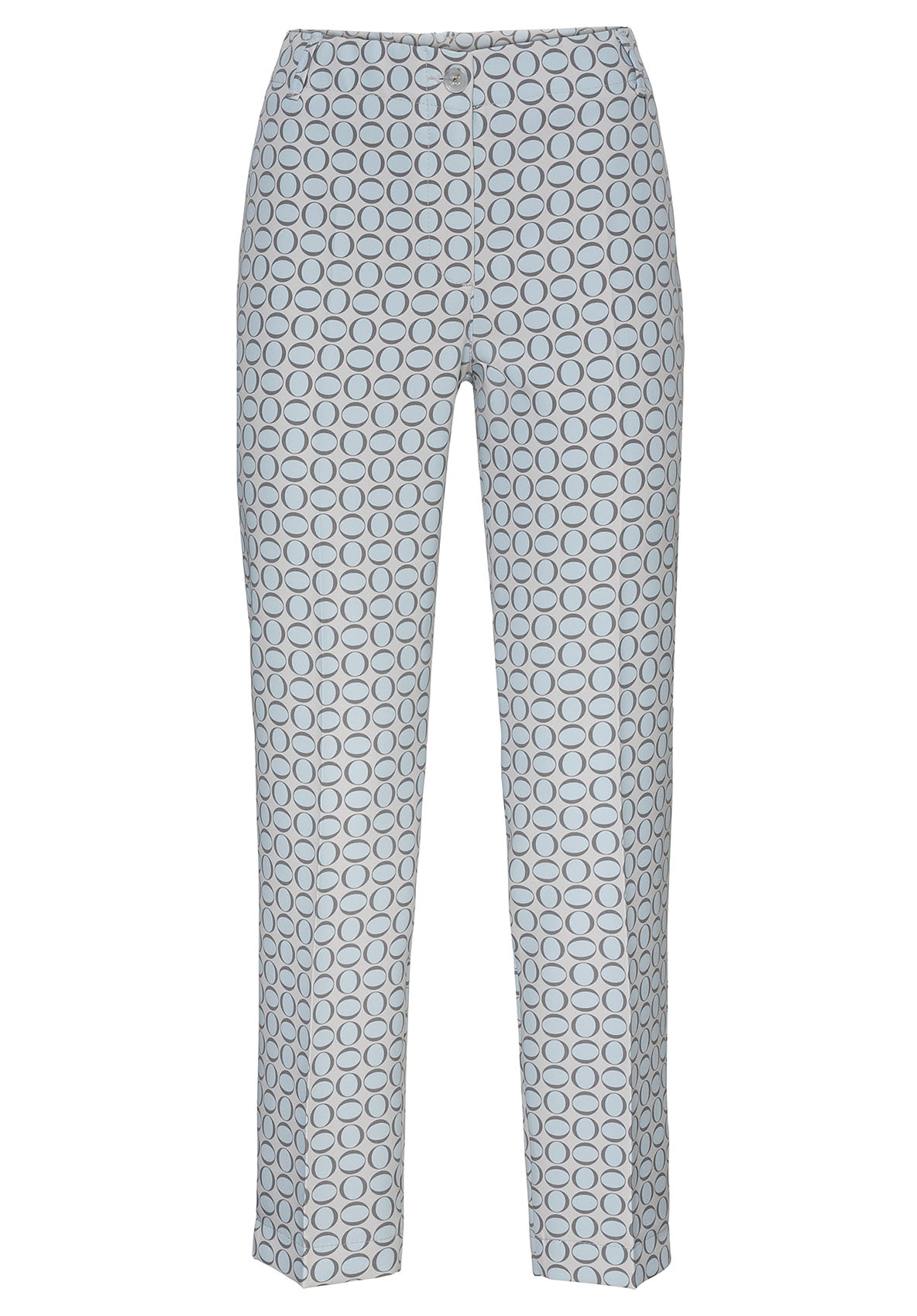 Эластичные брюки Siena с трендовым геометрическим принтом являются изюминкой коллекции марки Bianca. Эластичный материал повторяет движения тела и очень удобен в носке. Данная модель брюк имеет силуэт slim, среднюю посадку, длину 7/8 и пояс со шлевками. Брюки станут идеальной парой как для стильного образа. • брюки с голубым принтом в полоску • высококачественный материал • застежка-молния, небольшие разрезы по бокам • средняя посадка, силуэт slim • длина около 68 см, 7/8