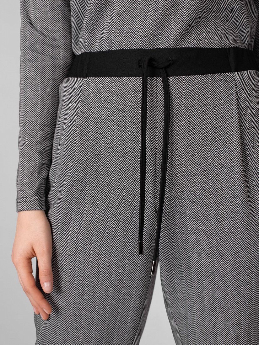 Брюки из трикотажного полотна зауженного к низу силуэта на притачном поясе с кулиской и завязками. Спереди боковые карманы, по низу брюк манжеты. Сзади карманы листочки.