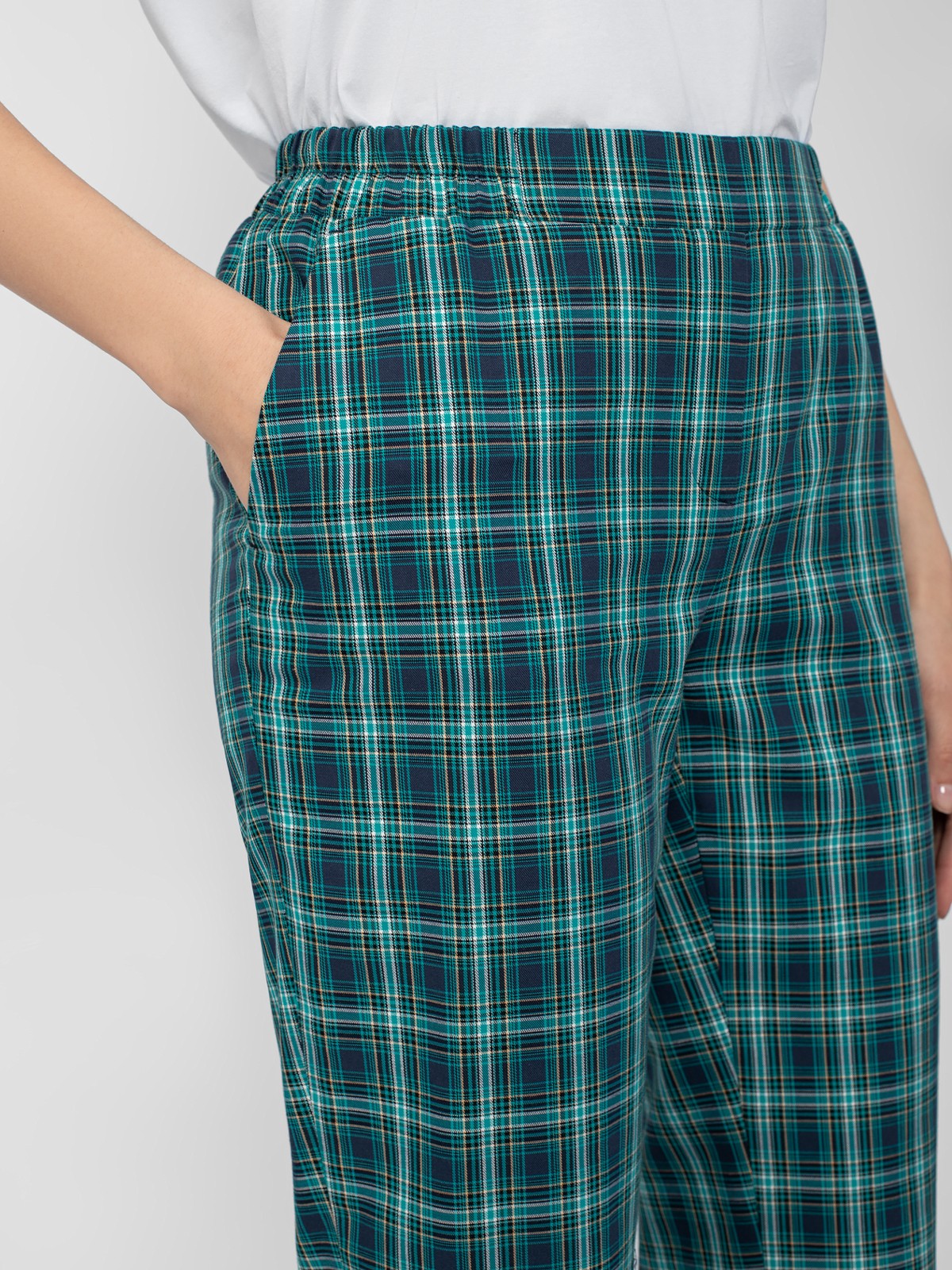 Брюки из костюмной ткани в клетку прямого силуэта зауженного к низу на притачном поясе с боковыми карманами.