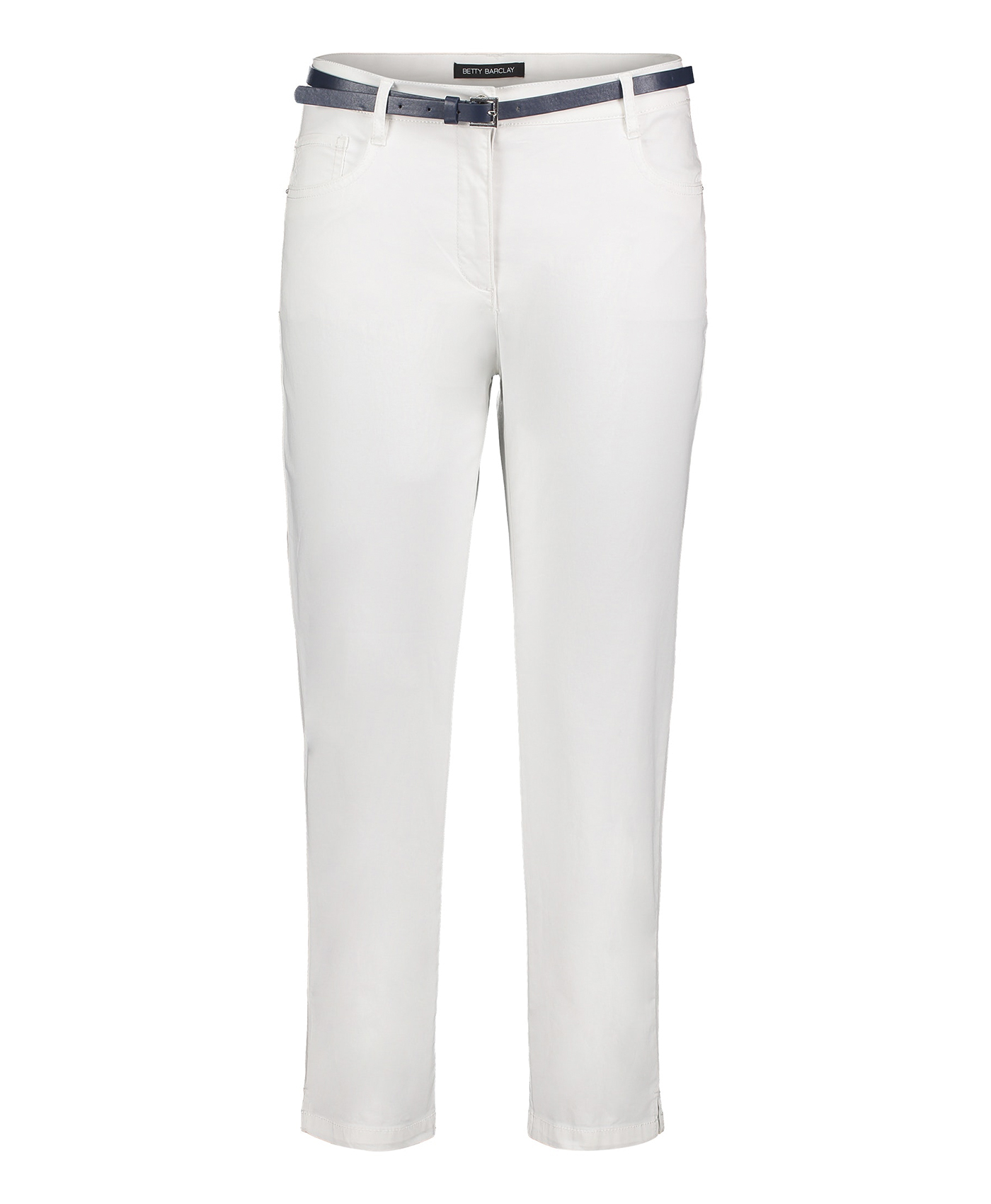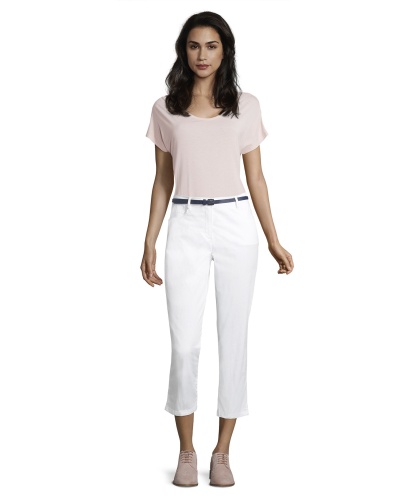 Укороченные брюки слегка расклешенного кроя обращают на себя внимание. Универсальная средняя посадка. Небольшие разрезы снизу по боковым швам. Приятный к телу материал из хлопковой смеси обеспечивает комфорт в ношении. В сочетании как с футболкой, так и с блузой эти брюки создают стильный современный образ.