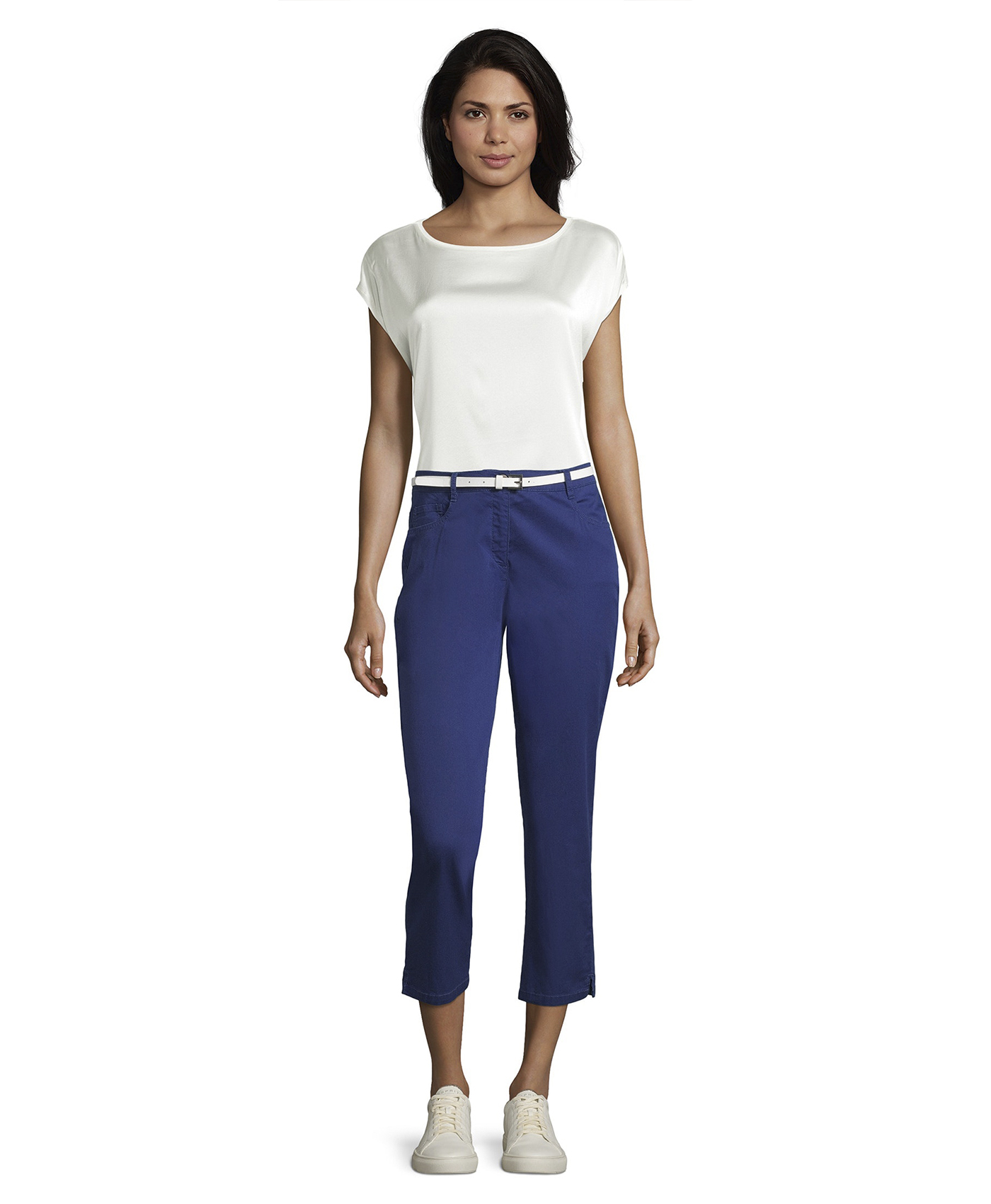 Укороченные брюки слегка расклешенного кроя обращают на себя внимание. Универсальная средняя посадка. Небольшие разрезы снизу по боковым швам. Приятный к телу материал из хлопковой смеси обеспечивает комфорт в ношении. В сочетании как с футболкой, так и с блузой эти брюки создают стильный современный образ.
