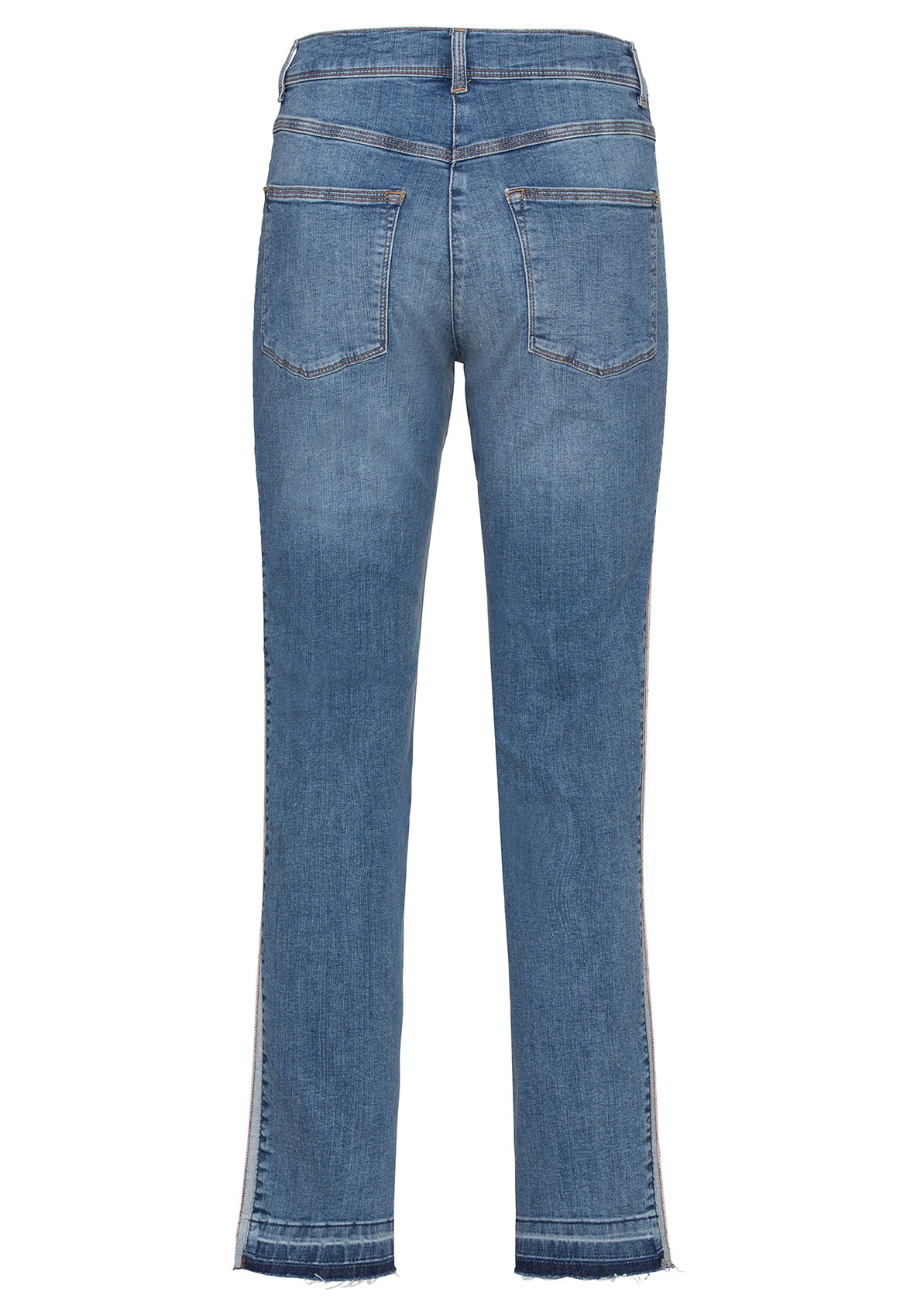 Джинсы Shape благодаря прилегающему силуэту подчеркивают линию ног. Модные потертости, полосы по бокам в спортивном стиле и открытый нижний срез с бахромой придают брюкам демократичный вид. Неважно, спортивный или шикарный образ вы создаете, эти джинсы станут вашей модной изюминкой сезона. • джинсы с эффектом потертости и бахромой по низу • эластичная хлопковая джинсовая ткань • 5 карманов • яркие полосы по бокам • силуэт slim, средняя посадка • длина около 74 см