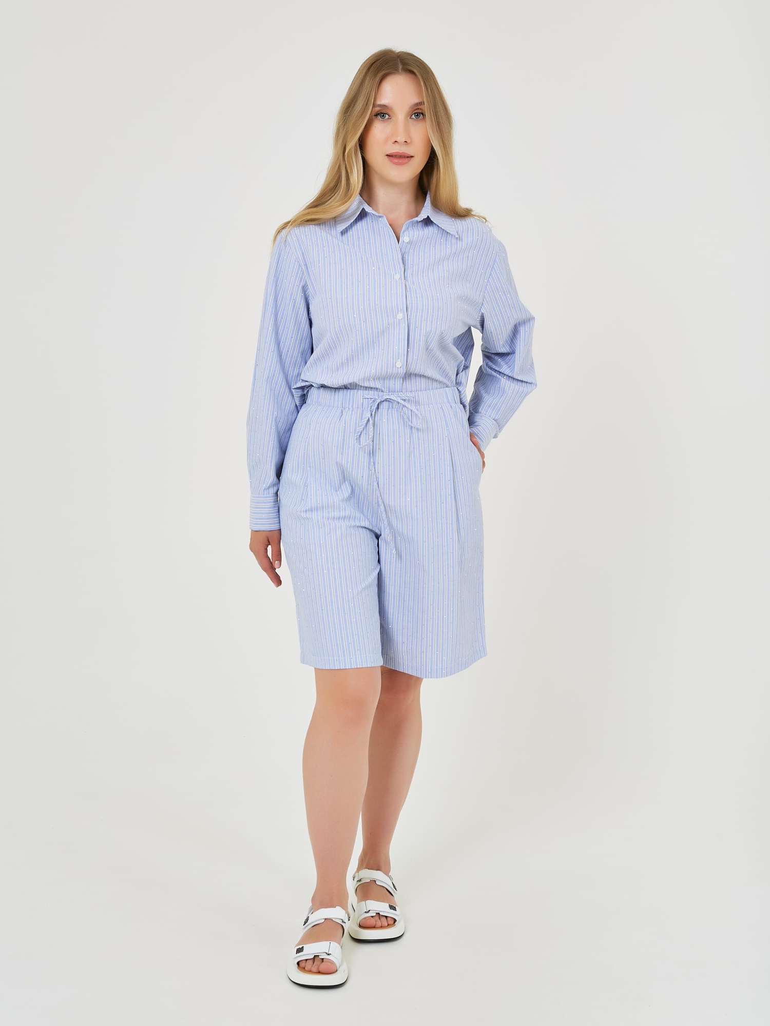 Шорты с эластичным поясом и завязками выполнены в светло-голубом цвете с тонкими вертикальными полосками и стразами, что придаёт им свежий и стильный вид. Коллекция Весна-Лето 2025. Капсула "Санторини". Параметры модели: 89-70-92, рост 167, размер 44-46