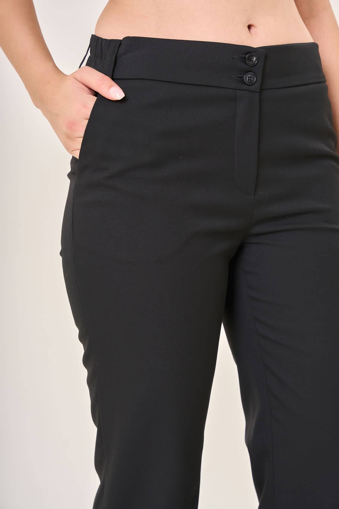 Женские классические брюки, слегка зауженные книзу. Комфортная посадка на талии и элегантный крой идеально подходят для офисного и повседневного гардероба. Сзади расположены два аккуратных накладных кармана, подчёркивающие классическую стилистику изделия. Плотная ткань сохраняет форму и выглядит презентабельно на любой фигуре.