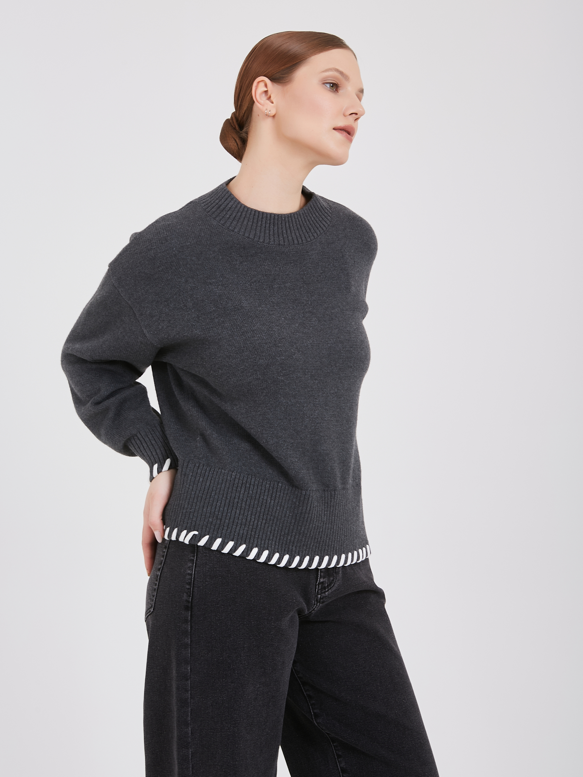 Женский темно-серый свитер свободного кроя. Длинные рукава и круглый вырез подчеркивают элегантность образа. Горизонтальные белые полосы на нижней части изделия и манжетах создают стильный акцент. Натуральный высококачественный материал приятен к телу и идеально подходит для прохладной погоды. Осень-Зима'25/26. Капсула "Вишневый сад"