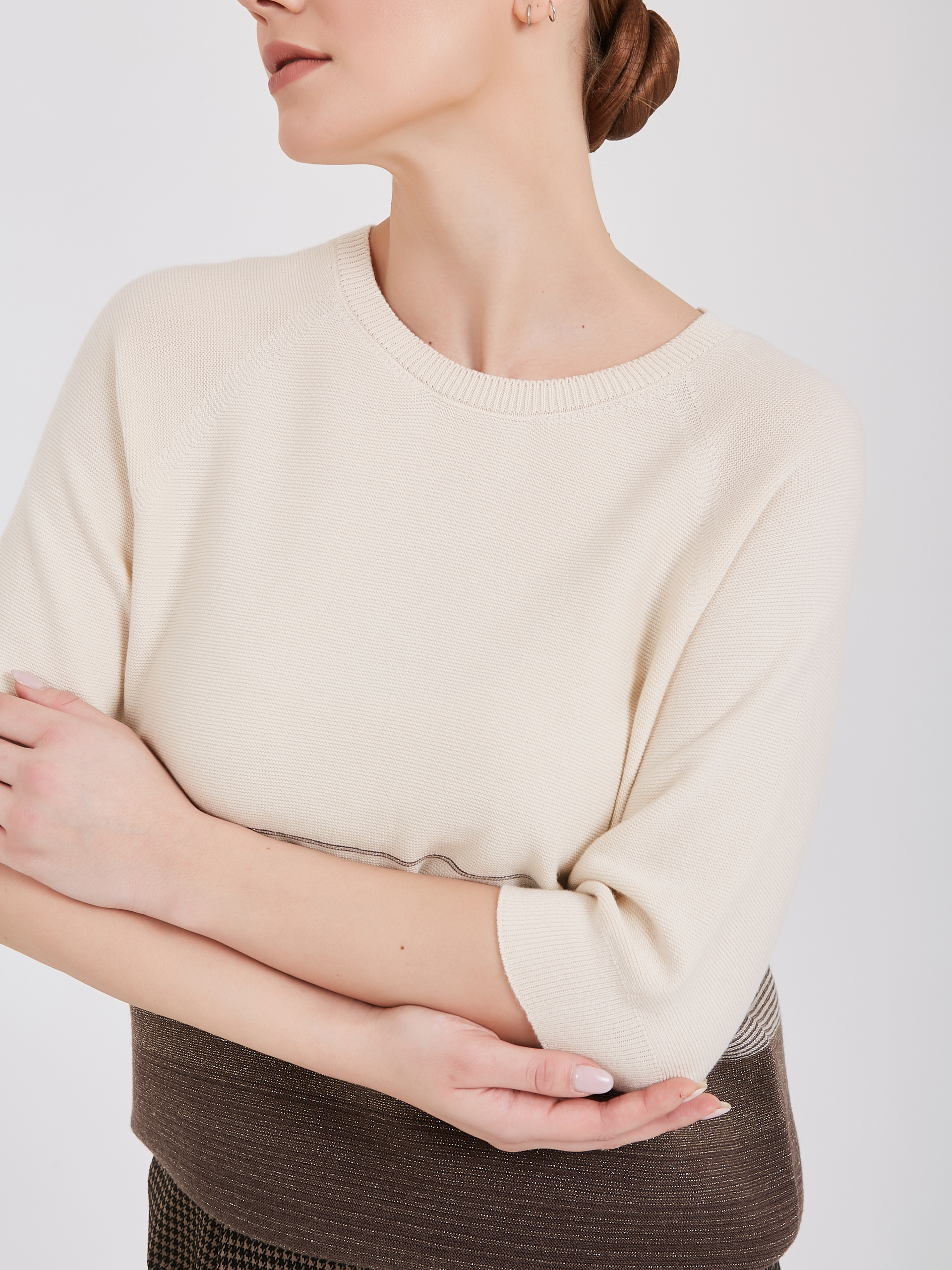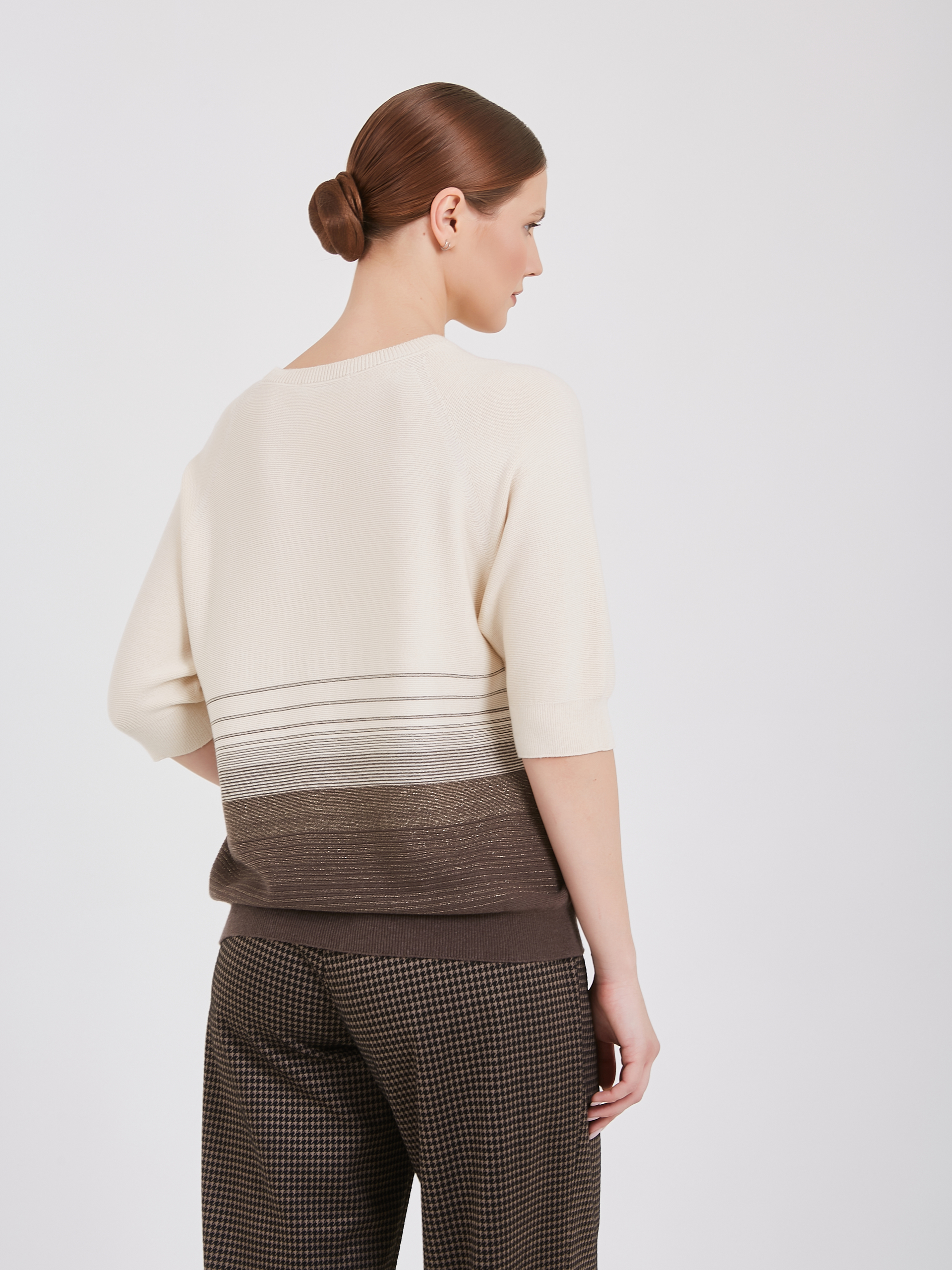 Женский кремовый джемпер свободного покроя. Рукава длиной три четверти и круглый вырез формируют изящный силуэт. Нижняя часть изделия украшена горизонтальными полосами, плавно переходящими от светлых тонов к насыщенным оттенкам коричневого, создавая динамичный визуальный эффект. Мягкий качественный материал обеспечивает комфорт и уют в любую погоду.Осень-Зима'25/26. Капсула "Вино из одуванчиков"