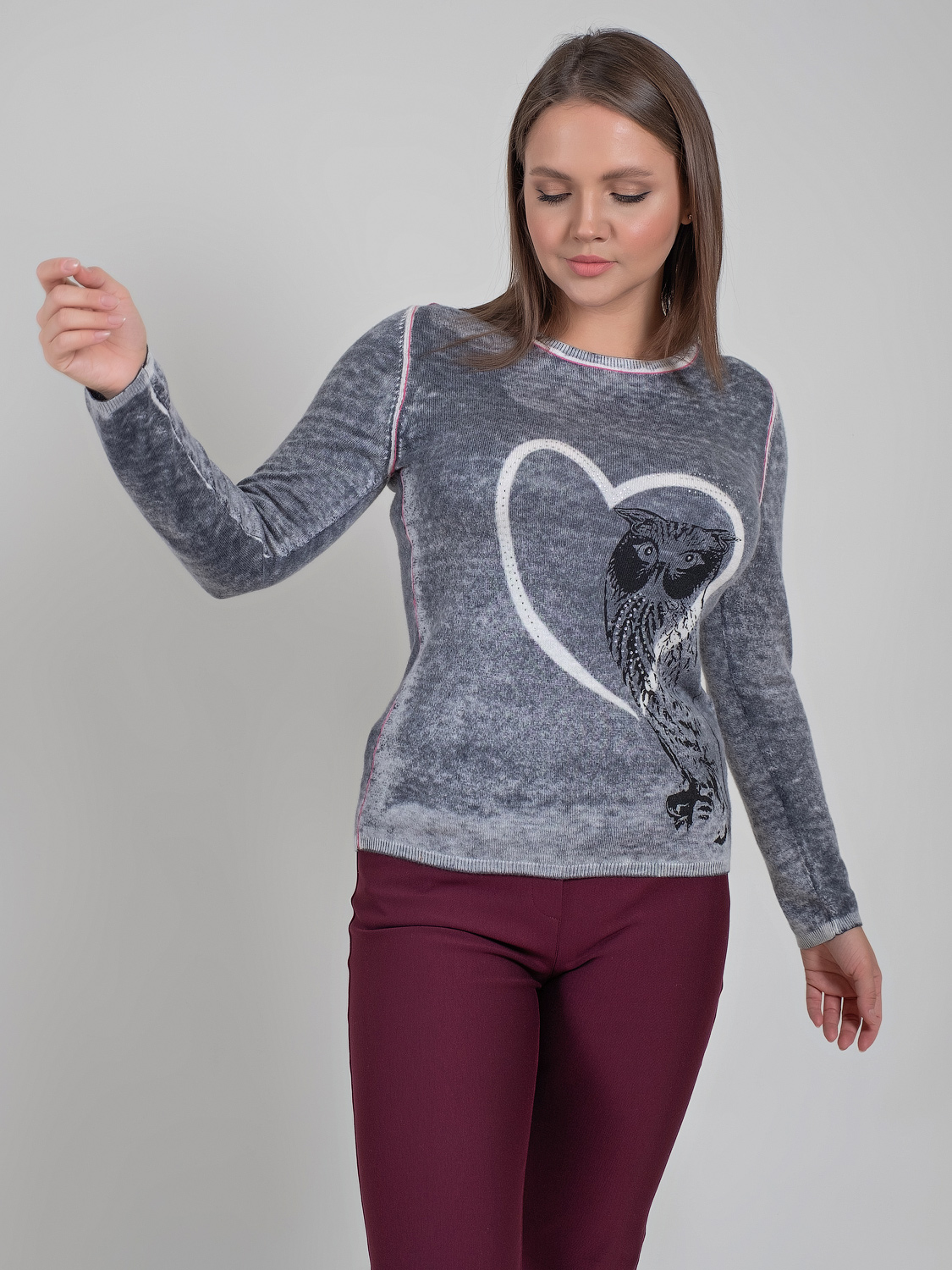 Мягкий джемпер с изображением совы и стразами может стать частью современного образа. Овальная горловина, вточной рукав полной длины.