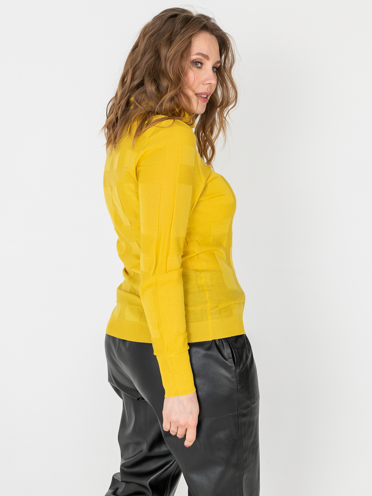 Однотонная водолазка – базовый элемент гардероба любой женщины. Геометрическая фактура задает динамику образу. Материал из натуральной шерсти. Втачной рукав полной длины, ворот-хомут.