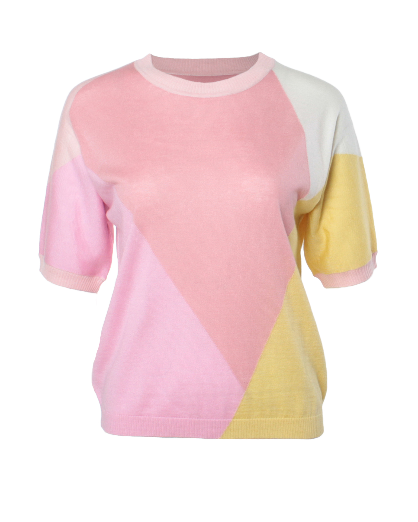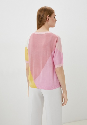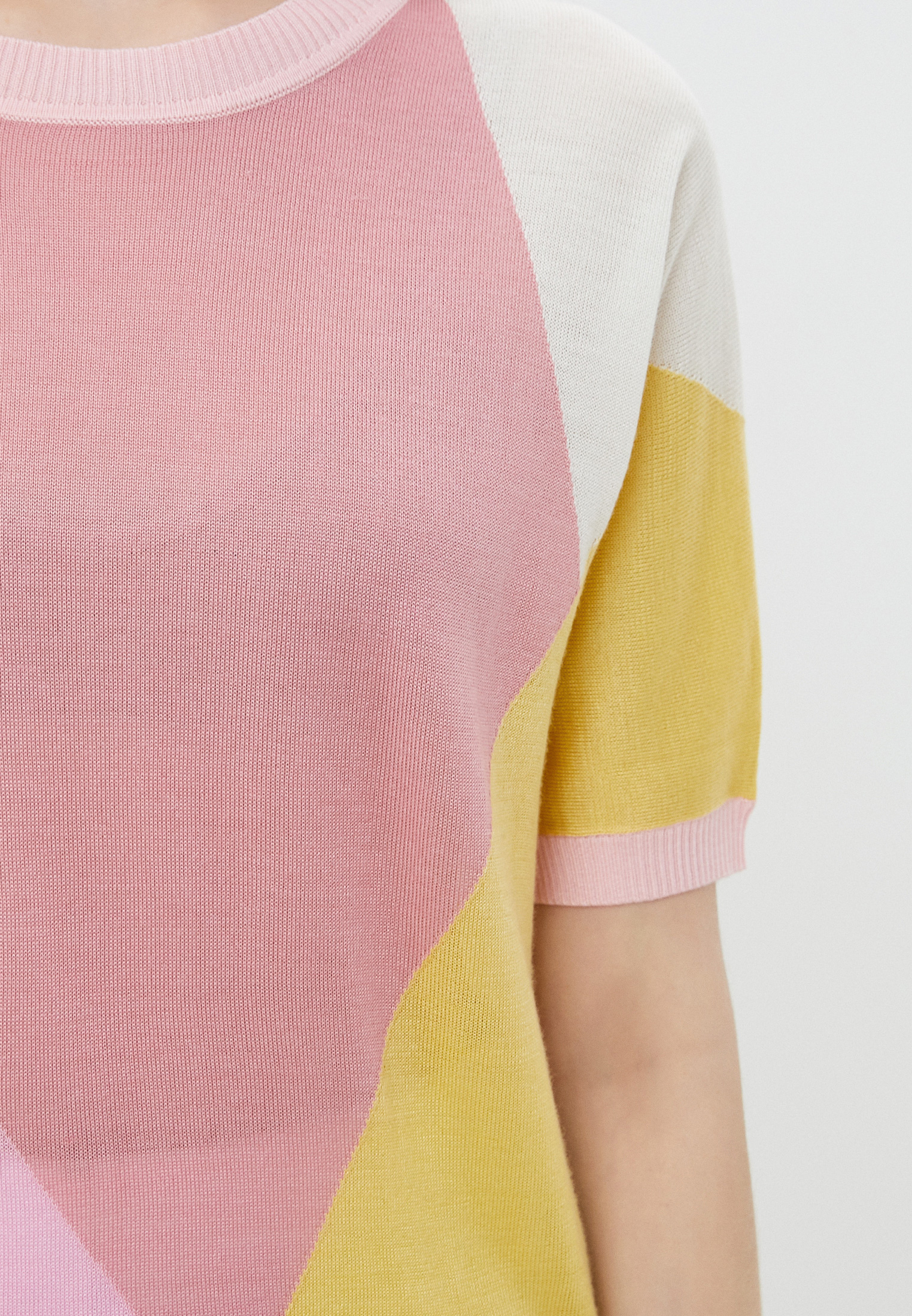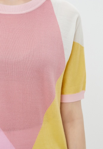 На сайте указаны Российские размеры. Ткань: смесовая ткань средней плотности. В составе: 23% шерсть, 32% тенсел, 45% акрил. Крой: слегка приталенный джемпер с коротким рукавом и круглым вырезом в стиле color blocking. Несмотря на то, что яркая геометрия принта приковывает сотни взглядов, она способна скрыть нюансы фигуры, о которых необязательно знать всем. Короткий комфортный рукав в спортивном стиле – выбор активных женщин, успевающих сделать 100 дел на дню. Отделка: оттенки ягодного зефира и лимонного пудинга не оставляют равнодушных. Рукава, низ и горловина отделаны резинкой, которая не давит, но обеспечивает деликатное прилегание к телу. Создайте нежный образ со свободными светлыми брюками или юбкой из коллекции Stern.