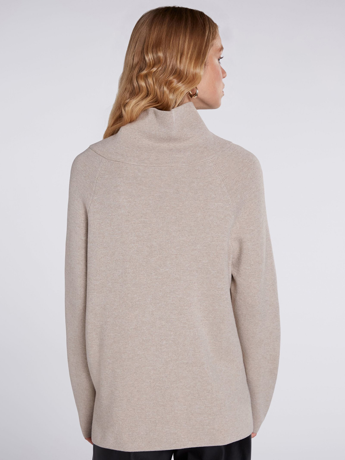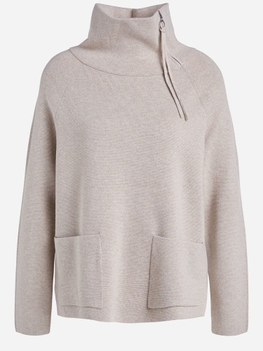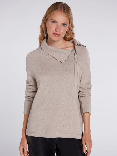 Бежевый джемпер с воротником-стойкой на молнии. Прямой покрой, разрезы сбоку, удлиненная спинка изделия. Два накладных кармана спереди. Приятный трикотаж из смесового хлопка приятен к телу и обеспечивает комфортное ношение. Длина 60 см для размера 42. Рост модели 178 см, ее размер – 42 (российский).