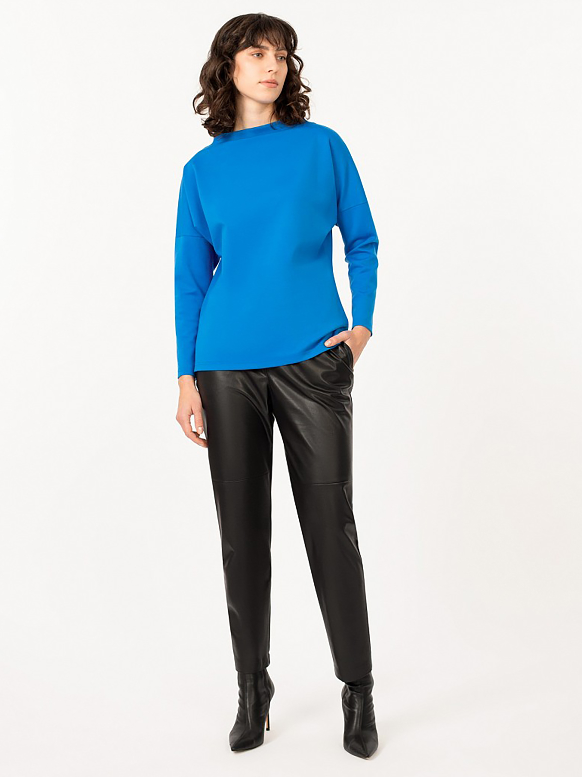 Насыщенный синий оттенок – бесспорный тренд сезона. Джемпер прямого кроя со спущенной линией плеч идеально впишется в образ в повседневном городском стиле. Вырез горловины лодочка. Материал приятен к телу и комфортен в ношении.