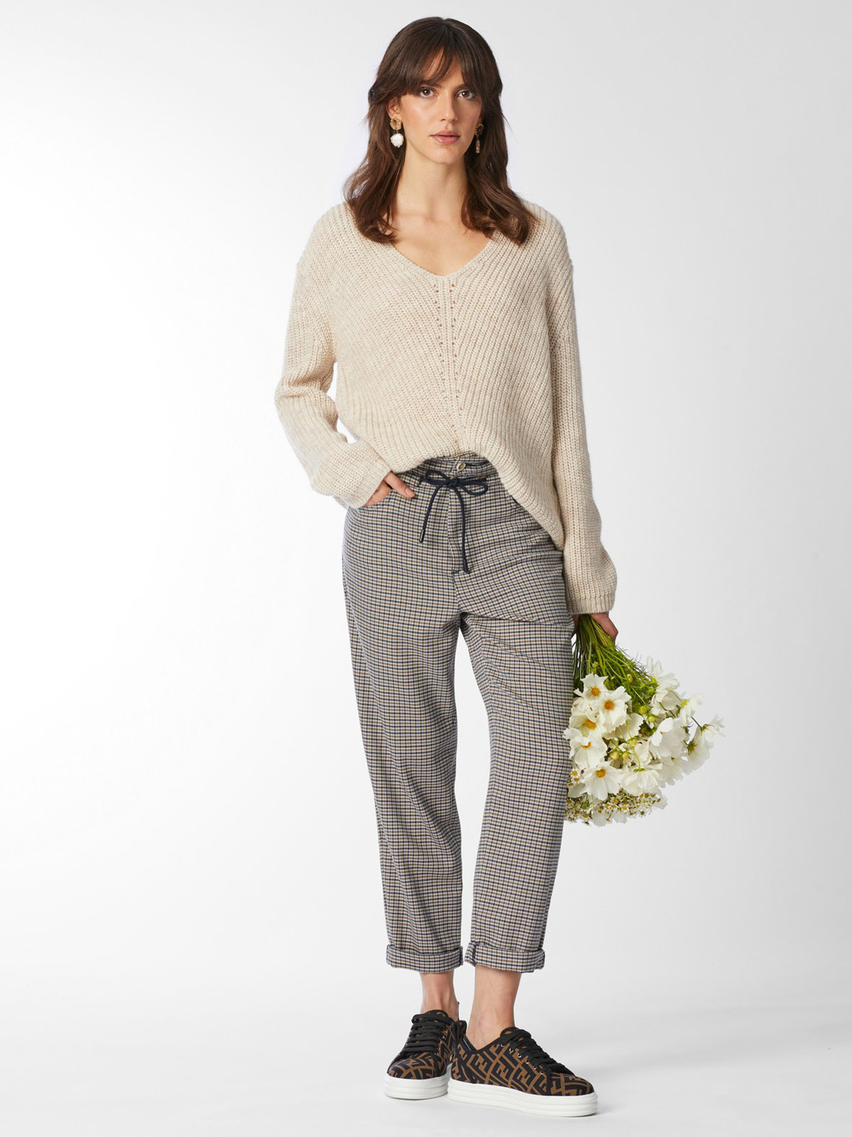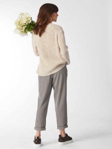 Пуловер крупной вязки с V-образный вырез горловины. Базовая модель прекрасно сочетается с различными образами. Свободный силуэт, спущенная линия плеча создают расслабленный образ. В составе материала шерсть альпаки, что делает пуловер приятным к телу.