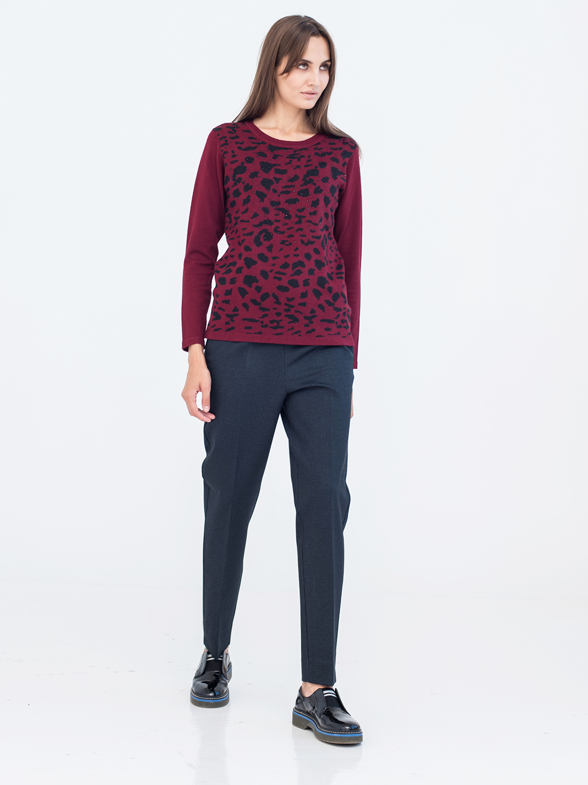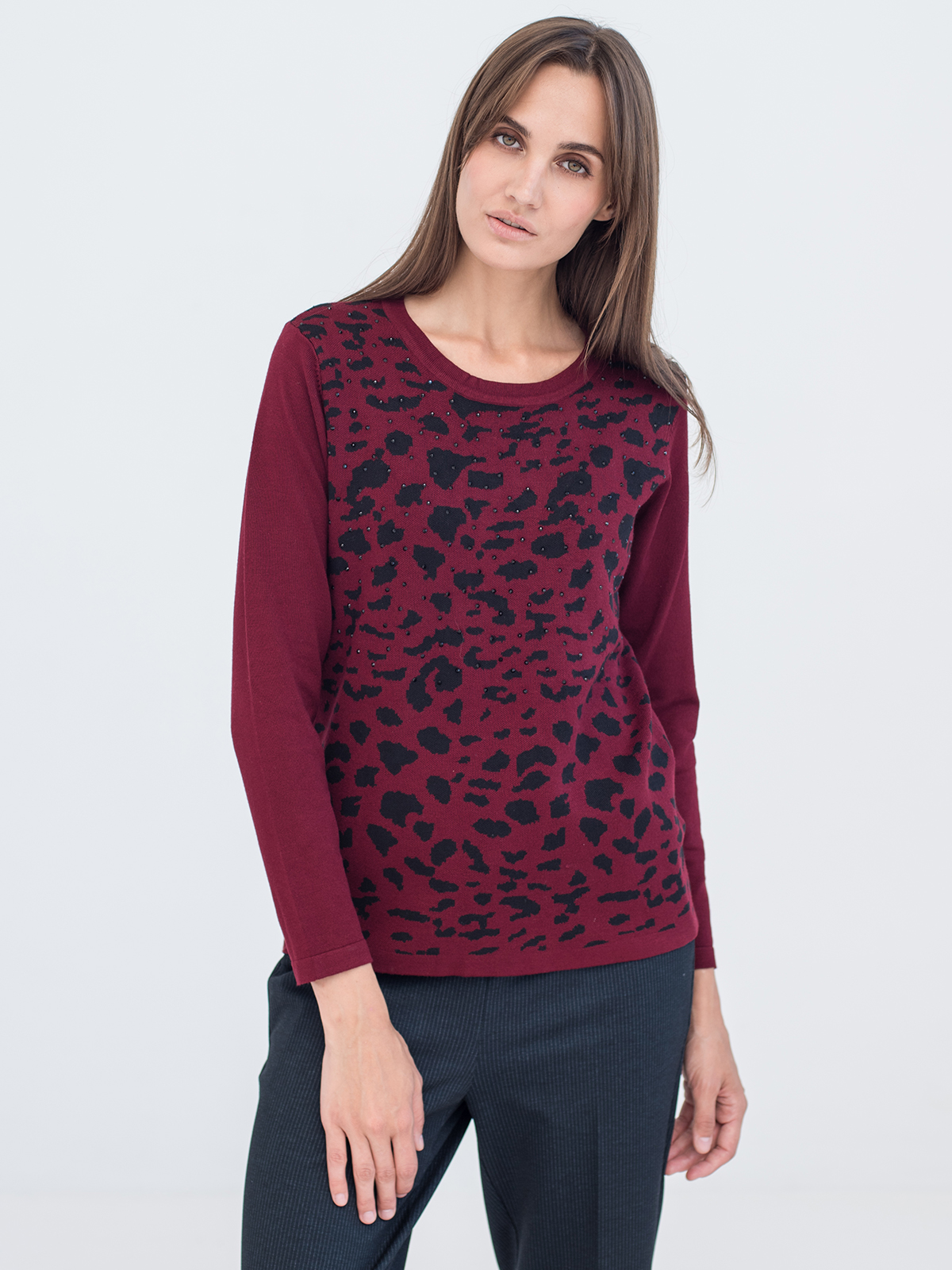 На сайте указаны Российские размеры. Анималистичный принт – бесспорный тренд этого сезона! Джемпер в насыщенном бордовом оттенке с леопардовым узором украшен стразами. Овальный вырез горловины подчеркивает изящество линии шеи. Прямой крой прекрасно подходит к разному типу фигуры. Джемпер хорошо сочетается как с брюками, так и с юбкой.