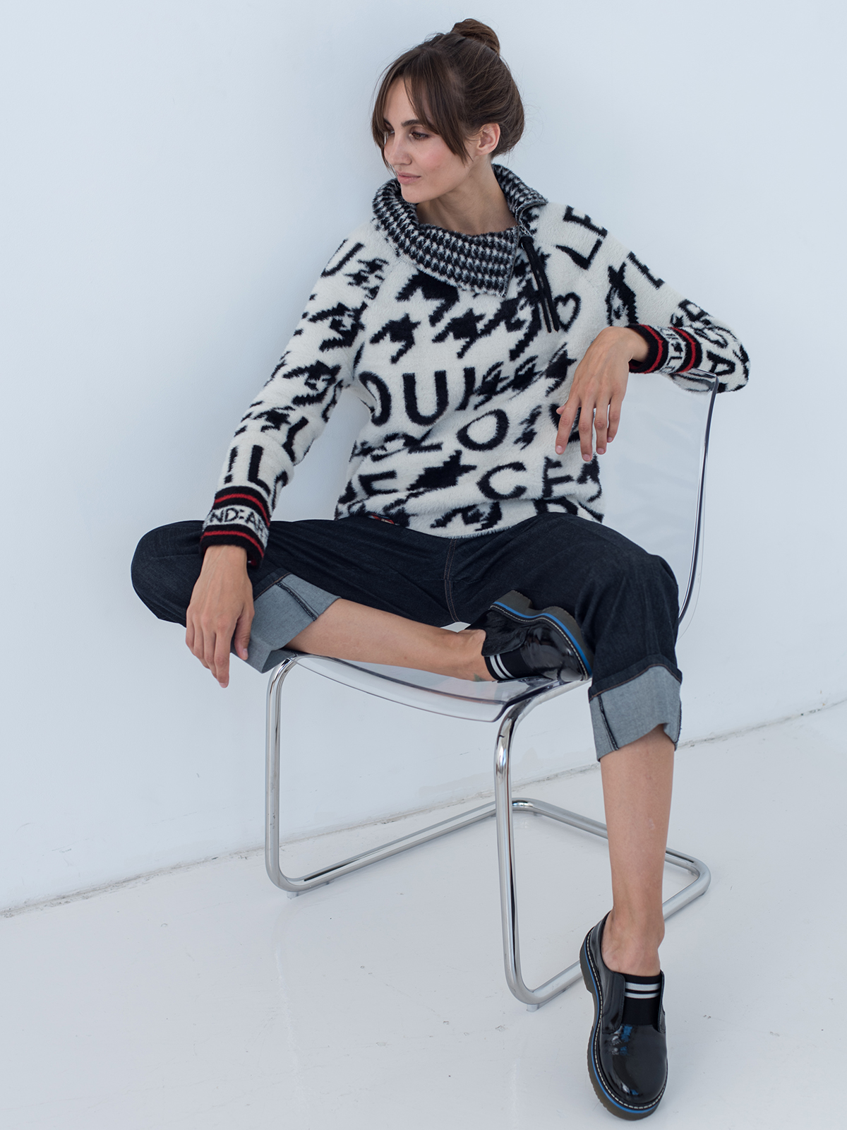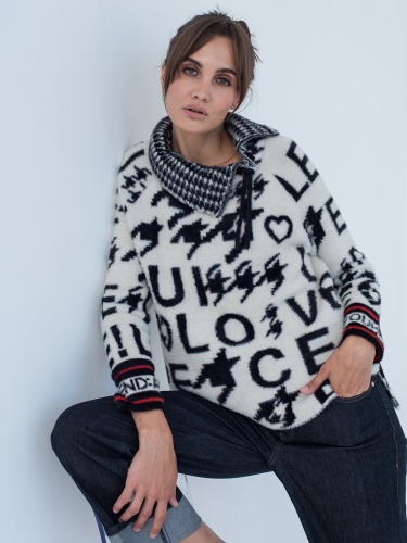 Джемпер с высоким воротником на молнии выполнен в черно-белой гамме. Актуальный илуэт оверсайз. Пуловер хорошо сохраняет тепло и подходит для создания трендовых образов в повседневном городском стиле.