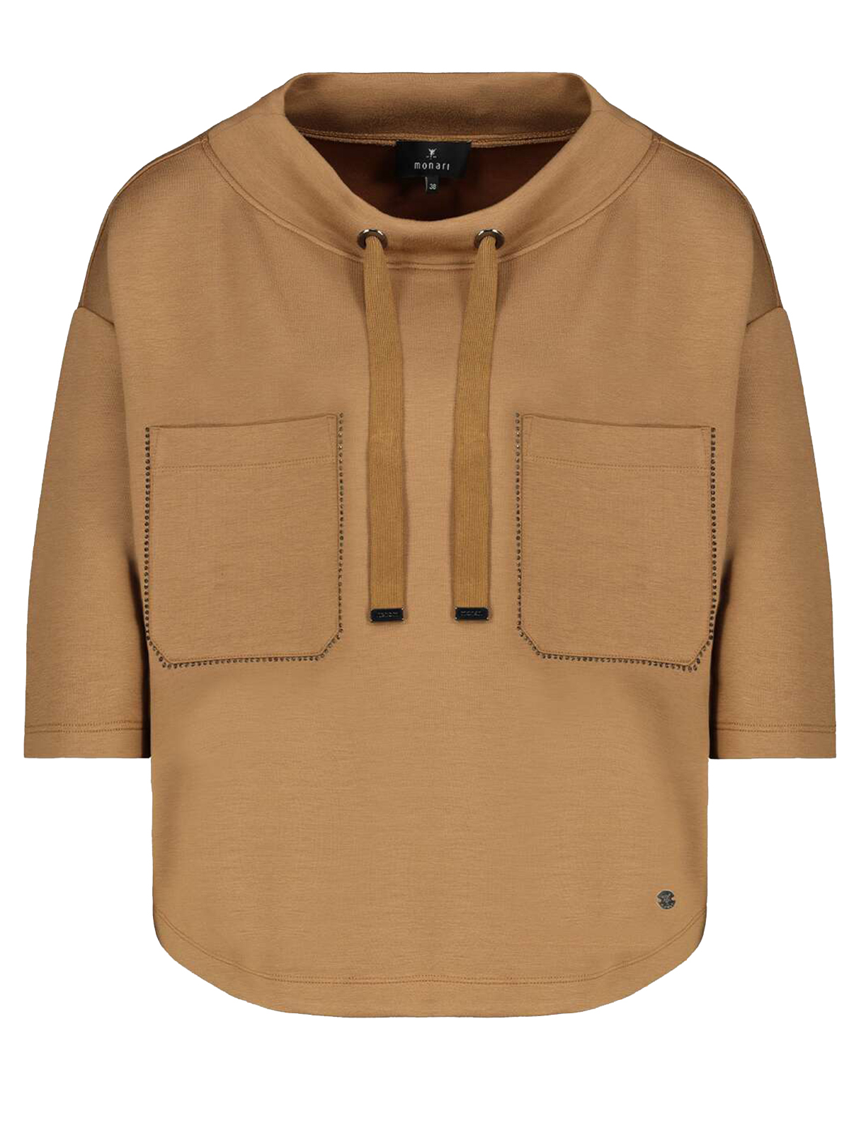 Однотонный пуловер свободного кроя с объемными накладными карманами на груди. Широкий воротник стойка с кулиской. Спущенная линия плеч, рукав до сгиба локтя.