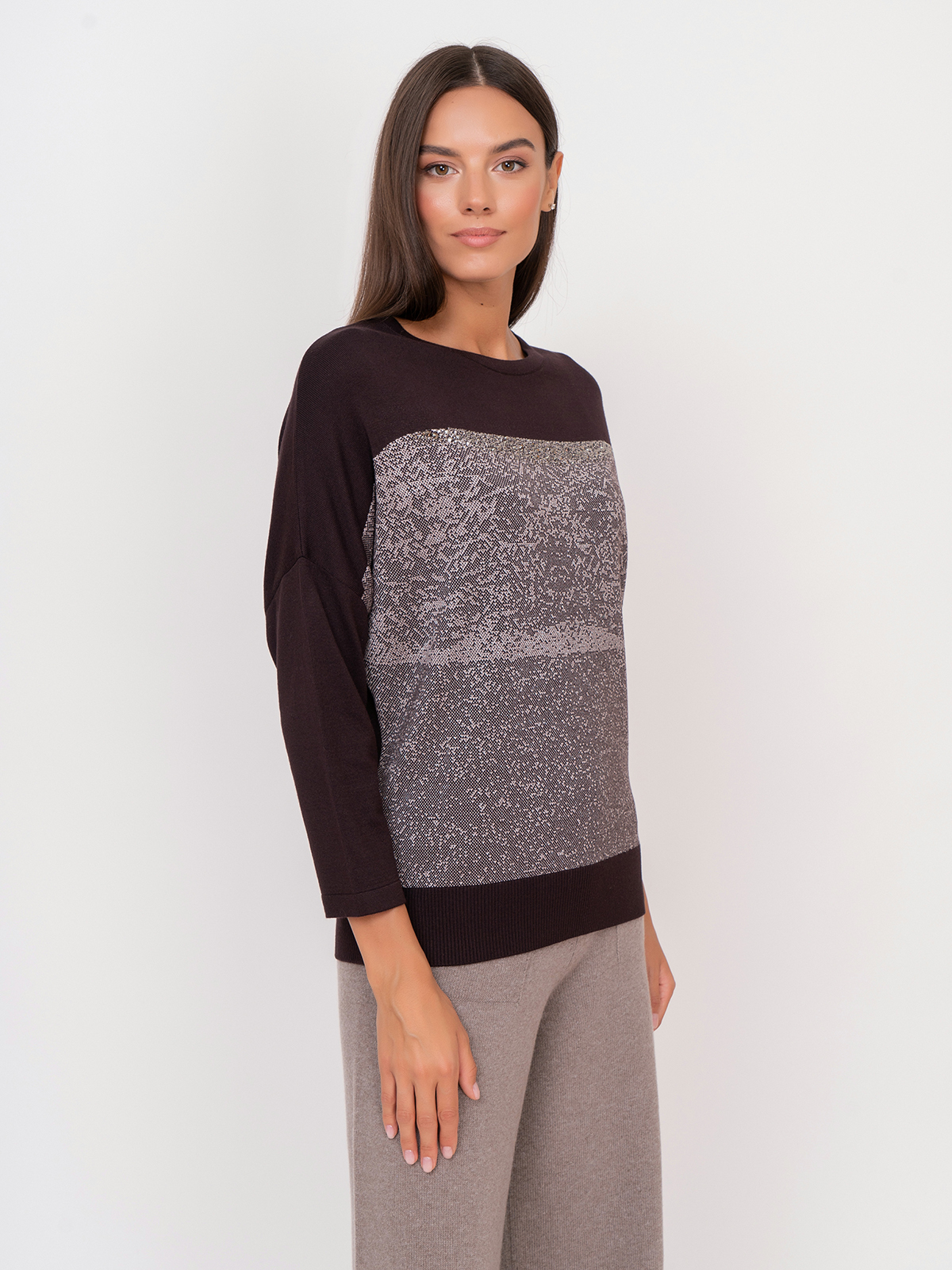 Джемпер с нитью люрекса подойдет для повседневного городского образа. Рукав 3/4, спущенная линия плеч, круглый вырез горловины.