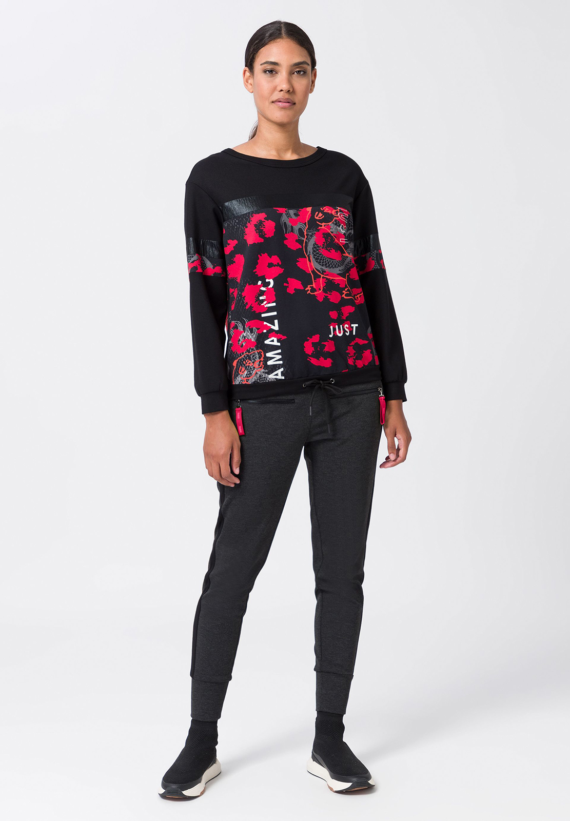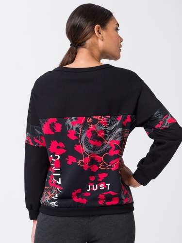Черный свитшот с ярким принтом. Широкий овальный вырез горловины, длинный втачной рукав, спущенная линия плеч. По низу эластичный пояс с кулиской.