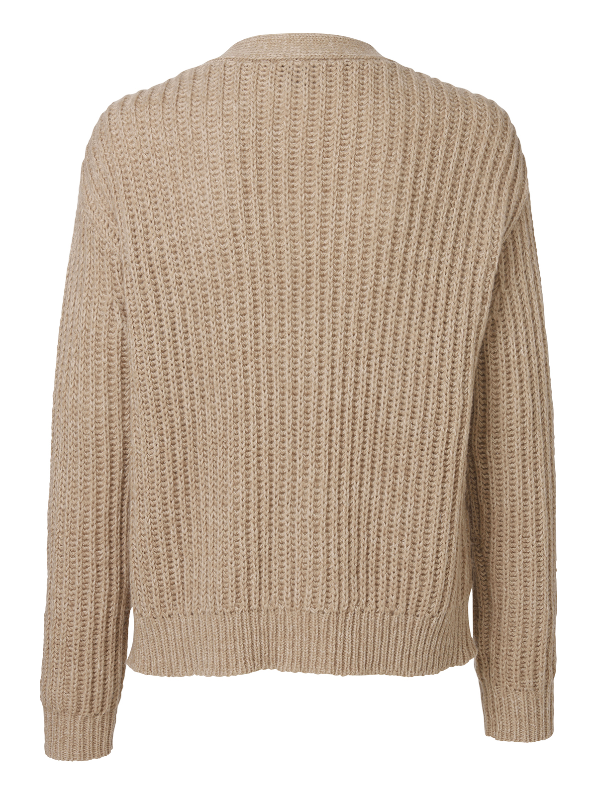Базовый однотонный кардиган с v-образным вырезом горловины. Длинный втачной рукав, спущенная линия плеч. Планка с пуговицами в тон изделия.