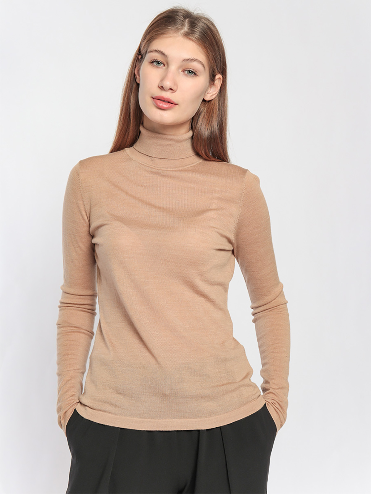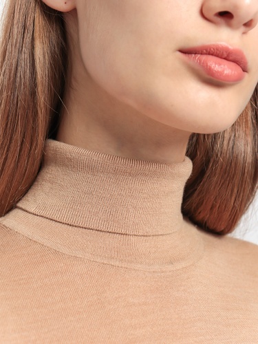 Однотонная базовая водолазка идеально подойдет для многослойных образов. Материал из 100% шерсти приятен к телу и хорошо сохраняет тепло. Приталенный силуэт, воротник-гольф, длинные втачные рукава.