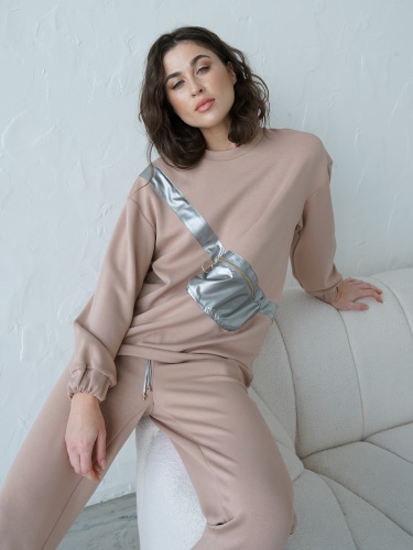 Свитшот прямого кроя с накладным карманом, стилизованным под поясную сумку. Руглый вырез горловины, длинные рукава с манжетами, спущенная линия плеч.