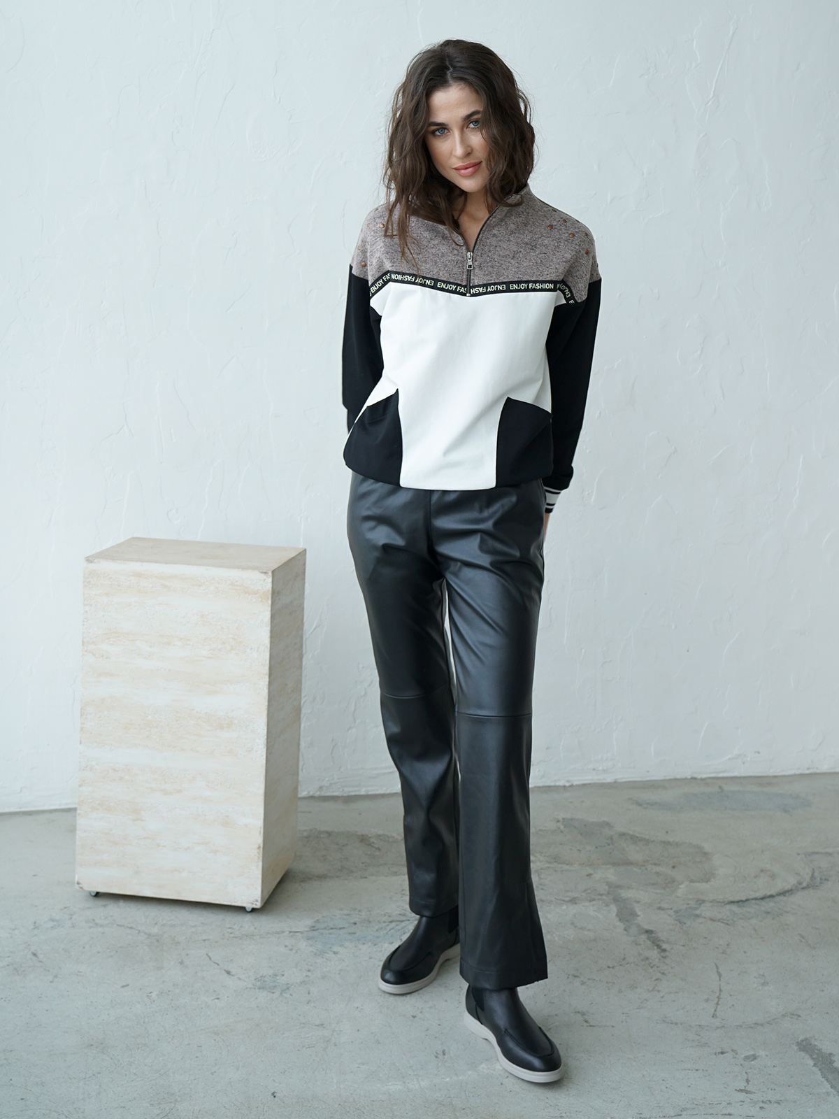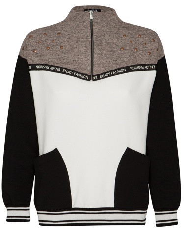 Джемпер в спортивном стиле выполнен из смесового хлопка. Высокий воротник-стойка на молнии, свободный силуэт, спущенная линия плеч. Длинные втачные рукава с эластичными манжетами. Контрастные накладные карманы.