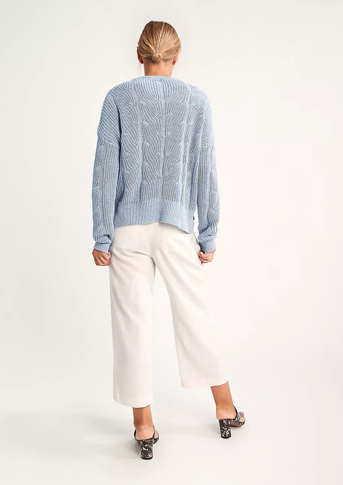 Однотонный джемпер крупной вязки. Материал из натурального хлопка. Свободный силуэт, спущенная линия плеч. Круглый вырез горловины, длинные втачные рукава.