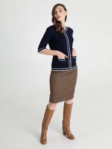 Элегантный темно-синий джемпер с контрастной отделкой по контуру изделия. Круглый вырез горловины, планка с пуговицами. Короткие втачные рукава, два накладных кармана спереди.