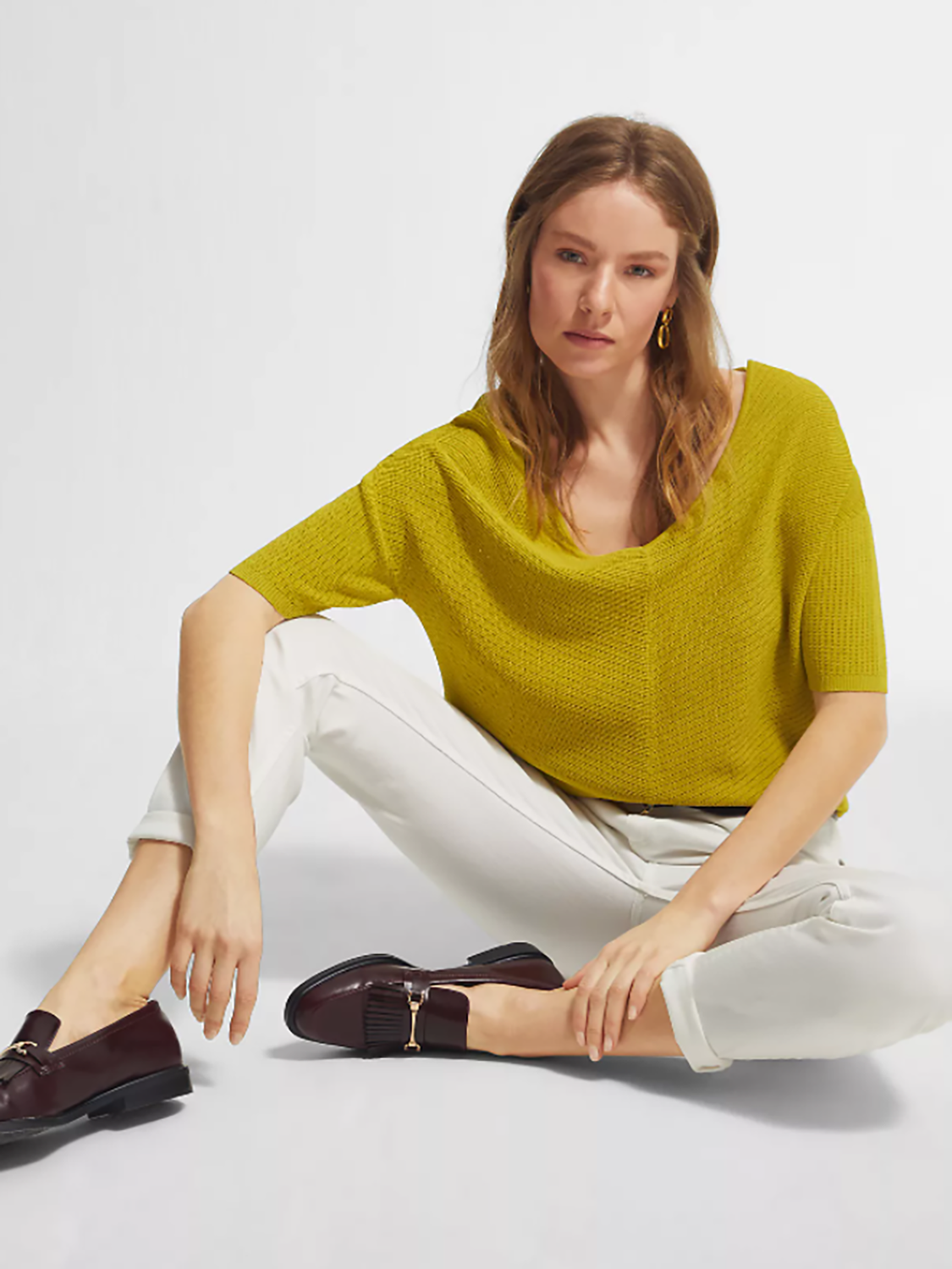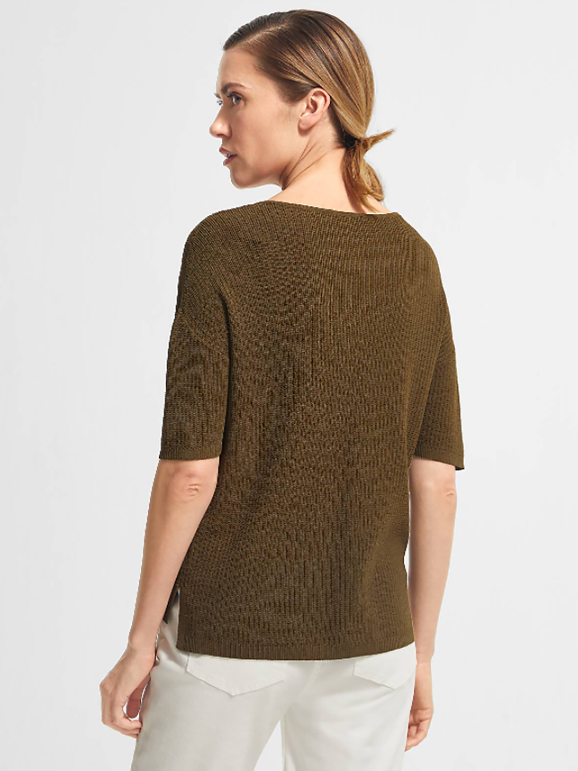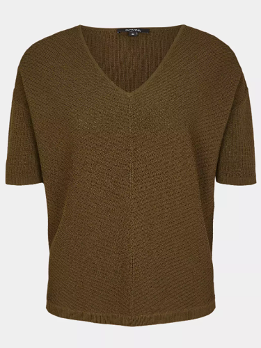 Однотонный джемпер мелкой вязки с глубоким V-образным вырезом горловины. Спущенная линия плеч, втачной рукав длиной до середины локтя. Свободный силуэт, невысокие вырезы по бокам.