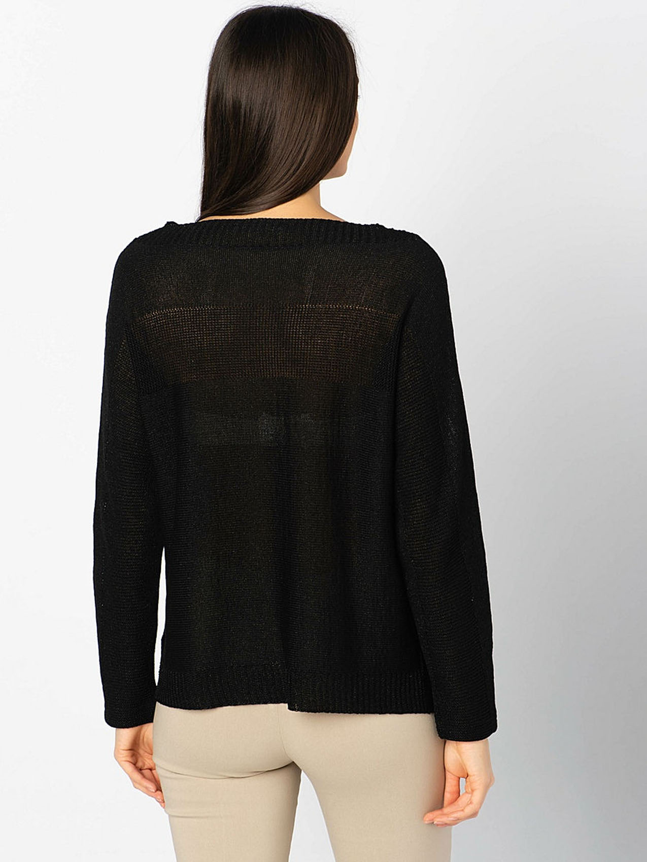 Приятный к телу джемпер из вискозы и полиэстера. Свободный покрой. Вырез "лодочка", длинные рукава. Небольшие разрезы по бокам. Длина изделия по спинке: 65 см.
