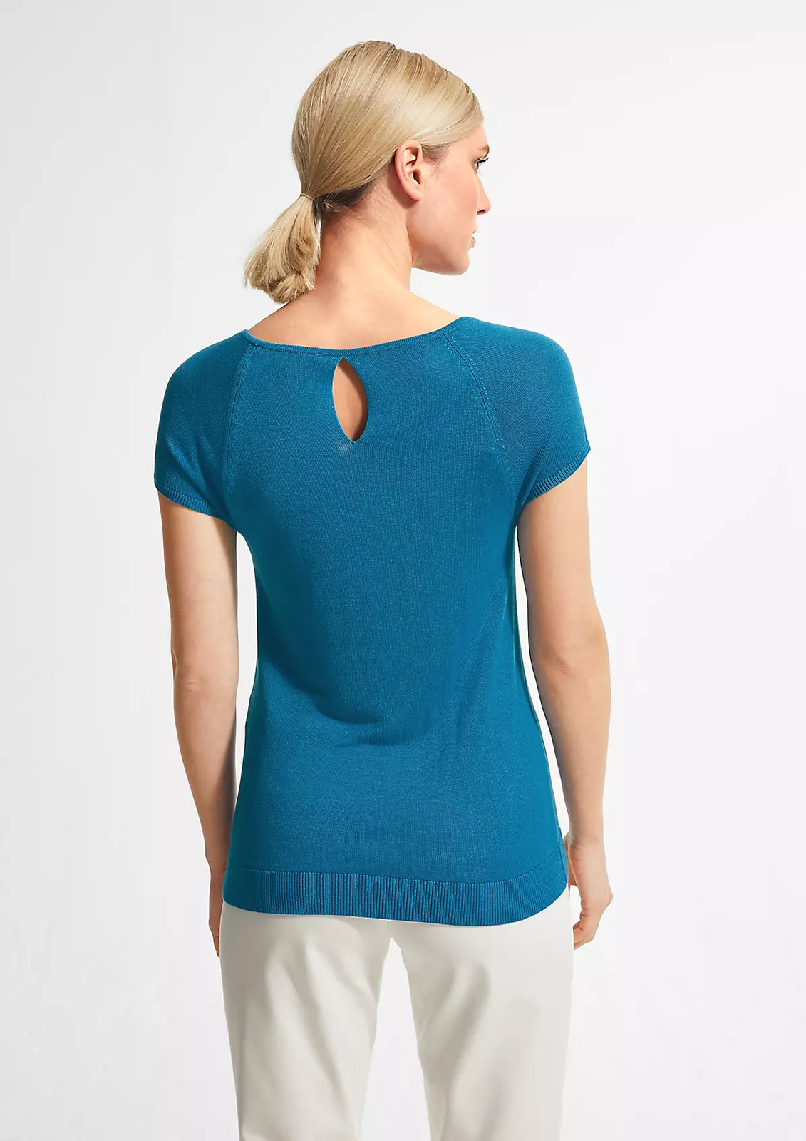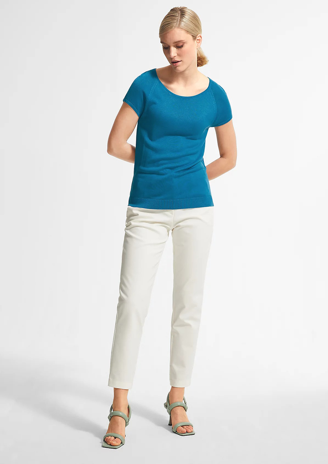 Однотонный джемпер – базовый элемент гардероба каждой женщины. Приталенный силуэт. Овальный вырез горловины выгодно подчеркивает линию шеи. Короткий рукав-реглан.