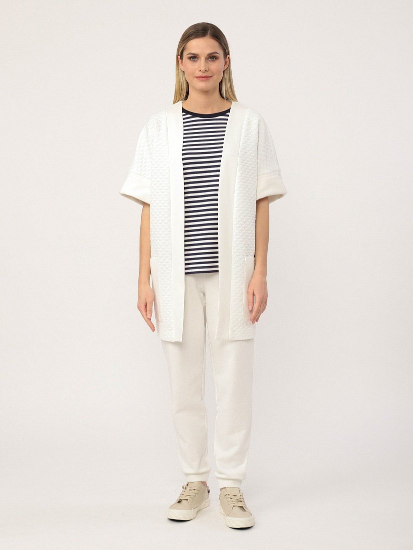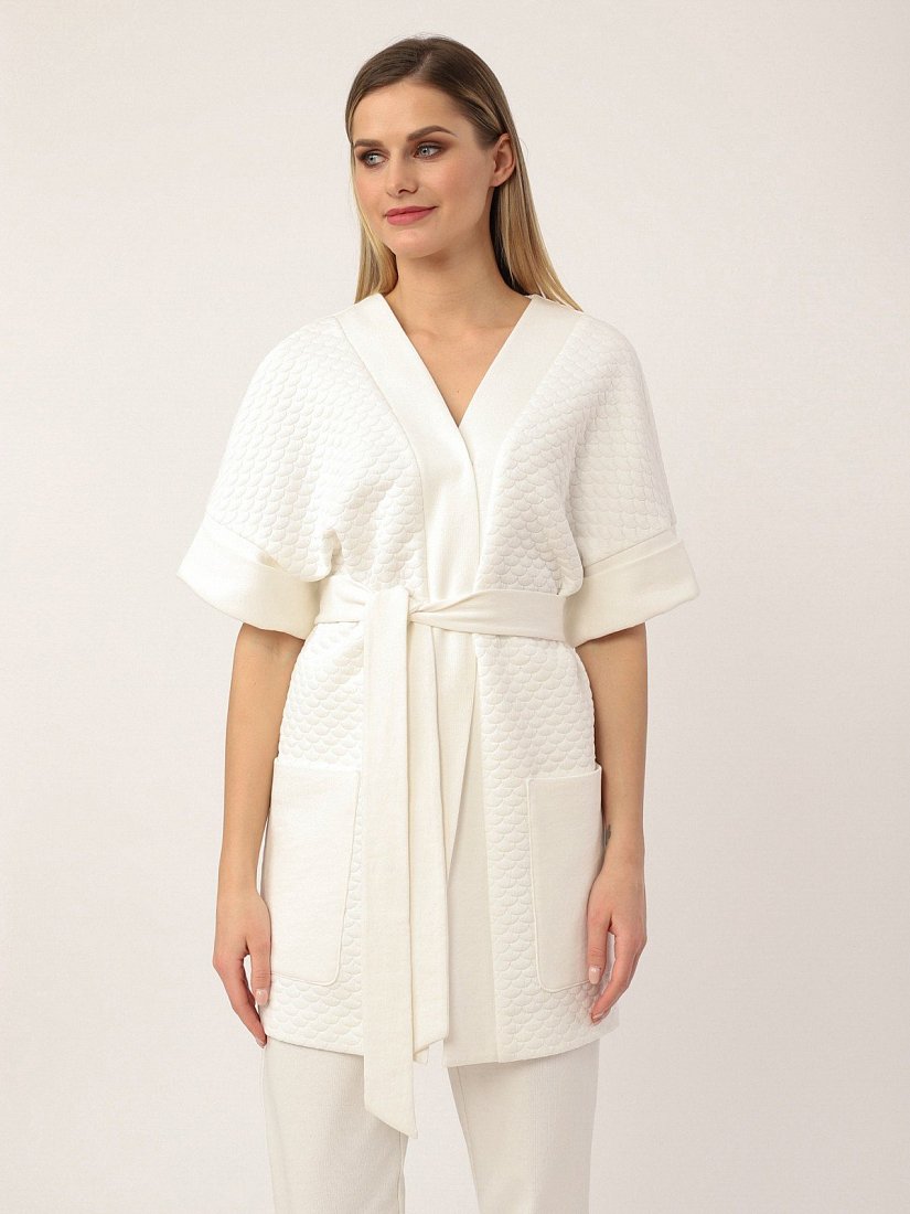 Жилет прямого силуэта из фактурного трикотажа для нежного образа. Акцент на талии за счет пояса в тон изделия. Укороченные рукава-кимоно с широким манжетом. По краю борта идет лента переходящая в горловину.