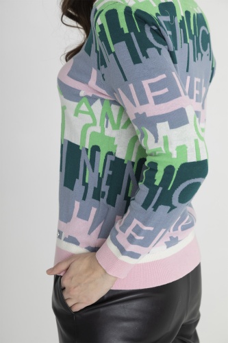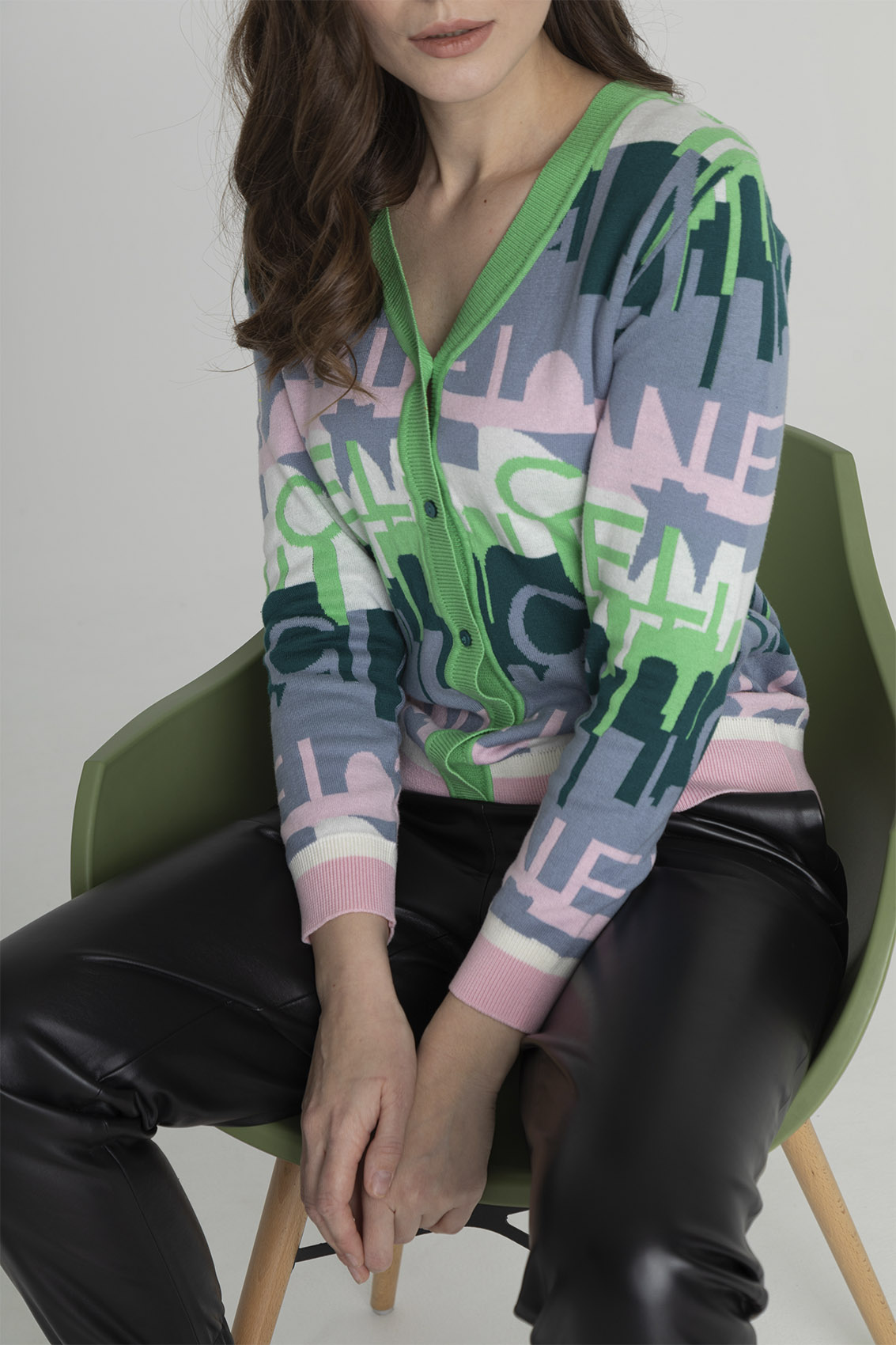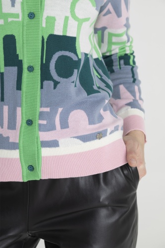 На сайте указаны российские размеры. Ткань: кардиган гладкий трикотажный из хлопка и акрила. Крой: слегка приталенный уютный кардиган с V-образным вырезом идеально садится по фигуре и подчеркивает ее достоинства. Длинный рукав с манжетом-резинкой можно подворачивать до желаемого уровня. Средняя длина надежно скрывает область живота, а вязка-резинка в нижней части изделия не позволяет ему подниматься при ходьбе и движении. Отделка: яркий принт с буквами создает особое настроение. Планка с контрастными пуговицами повторяет фактуру манжетов и низа изделия, что добавляет гармонии всему образу. Украшен фирменной металлической эмблемой-шильдиком в передней нижней части. К яркому верху лучше подбирать более спокойный однотонный низ из коллекции одежды Stern.