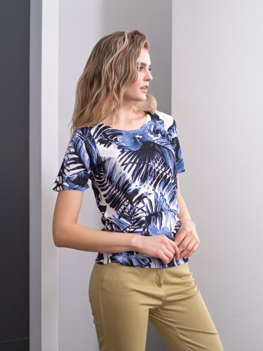 Прямой покрой джемпера скроет недостатки фигуры. Круглый вырез горловины создаст женственный образ. Модный в новом сезоне принт с тропическим мотивом подчеркнет чувство вкуса обладательницы джемпера. Данная модель будет удачно сочетаться как с брюками, так и с юбкой.