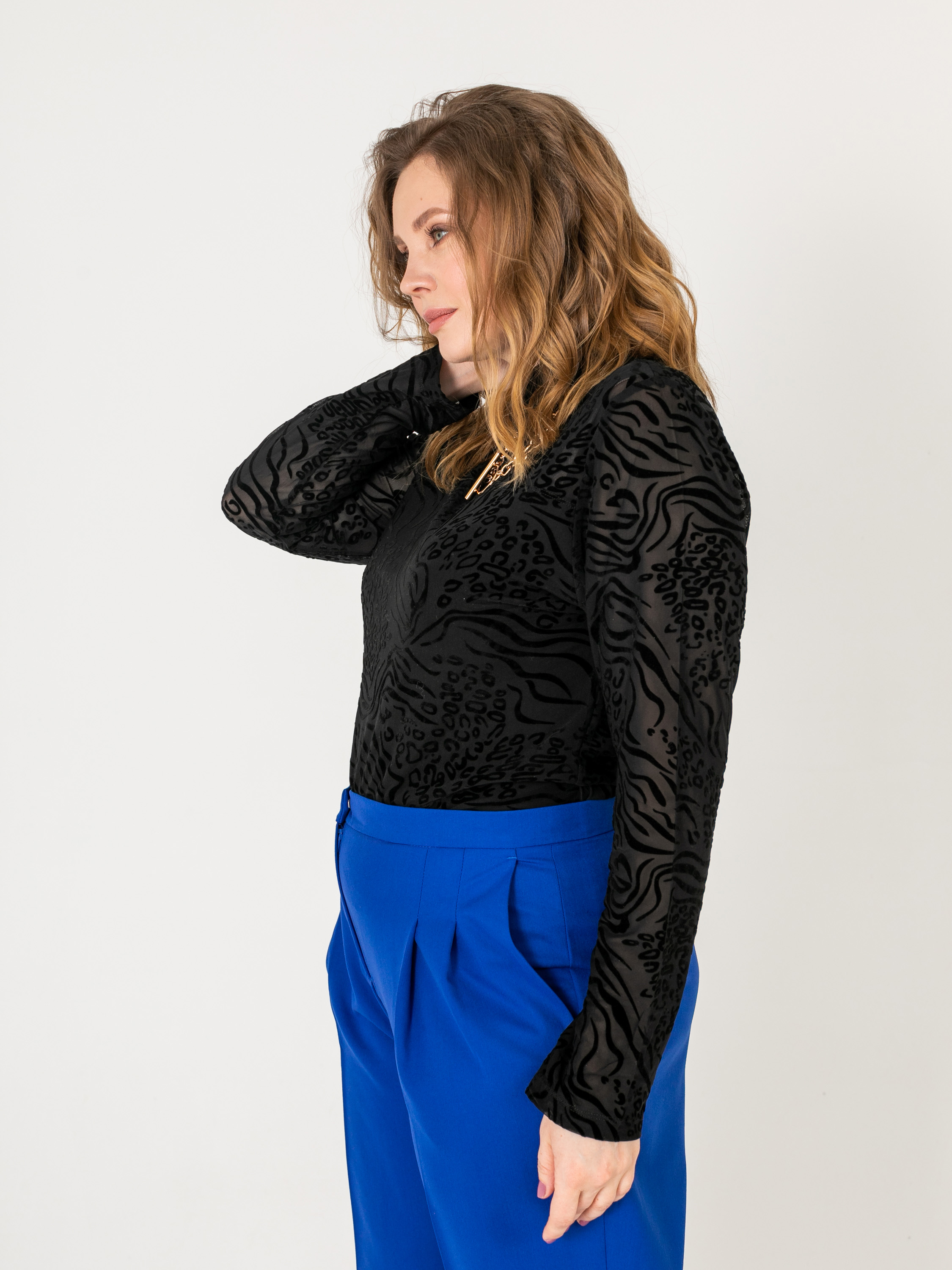 На сайте указаны российские размеры. Ткань: водолазка выполнена из легкого, струящегося нейлона, который так же приятен телу, как шелк. Эластан в составе обеспечивает небольшое растяжение. Крой: слегка приталенный силуэт подчеркивает красоту изгибов женского тела. Передняя часть изделия имеет подклад, задняя часть и рукава – без него, что позволяет показать изысканность ажурного материала. Высоту горла водолазки можно регулировать подгибом. Отделка: в основе стильного ажурного рисунка на ткани лежат животные мотивы, которые выглядят уместно и торжественно. Насыщенный черный цвет водолазки дает возможности для создания как повседневных, так и вечерних образов. Сочетайте блузку с контрастными брюками, юбками-карандаш и жакетами из коллекции Stern.