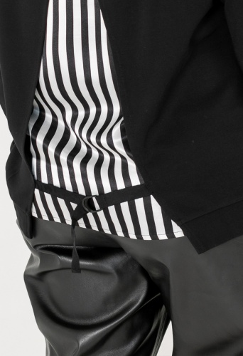 На сайте указаны российские размеры. Состав: смесовая ткань средней плотности. В составе: 30% хлопок, 65% вискоза, 5% эластан. Отделка: 96% полиэстер, 4% эластан. Крой: лаконичный джемпер прямого силуэта с длинным рукавом и круглым вырезом. Идеально садится по фигуре, скрывая недостатки, а насыщенный черный цвет визуально делает образ еще стройнее. Отделка: спинка джемпера украшена декоративной вставкой из гладкой ткани, детали основного материалы соединяются перемычкой в цвет. Обратите внимание на коллекцию кожаных брюк в соответствующем разделе нашего сайта. Они идеально подходят к этому джемперу.