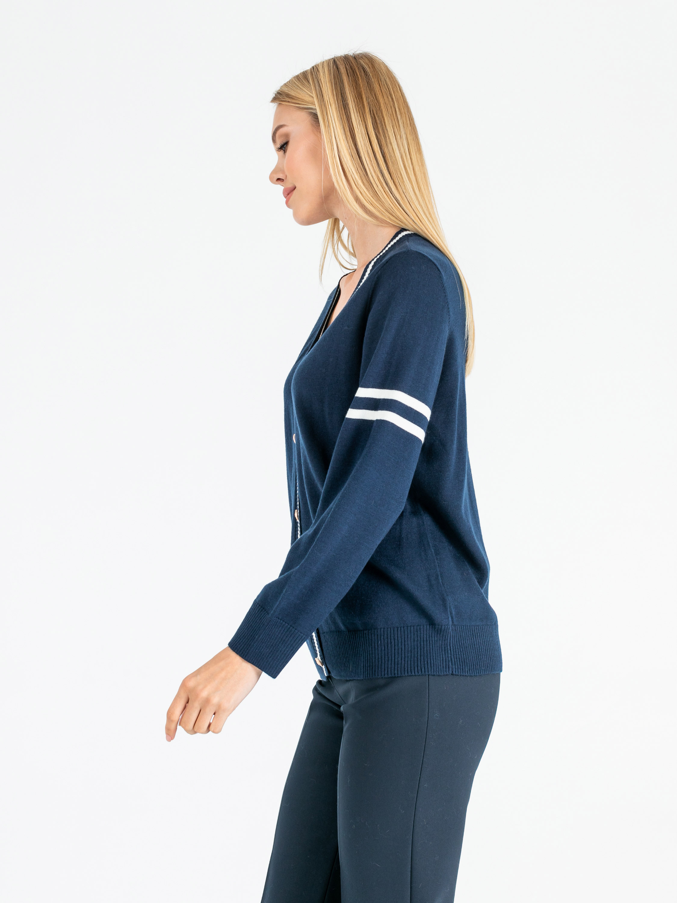 На сайте указаны российские размеры. Ткань: выполнен из мягкого и уютного материала – смеси шерсти и акрила. Крой: прямой силуэт, благородный темно-синий цвет и изысканный V-образный вырез делают этот кардиган лучшим вложением в стильный гардероб. Пуговицы – функциональны, а значит, можно носить кардиган как в застегнутом, так и в расстегнутом виде. Длина рукава с манжетом-резинкой регулируется до желаемого уровня. Отделка: кардиган в стиле casual со спортивными элементами – контрастными полосками, которые моментально делают образ запоминающимся. Золотистые фактурные пуговицы с оттиском добавляют шика и приковывают внимание к себе. На спине расположен фирменный шильдик-эмблема. Кардиган может выступать как самостоятельная деталь одежды, так и служить компаньоном для водолазки, футболки, блузки и рубашки из ассортимента Stern. Рост модели - 177 см