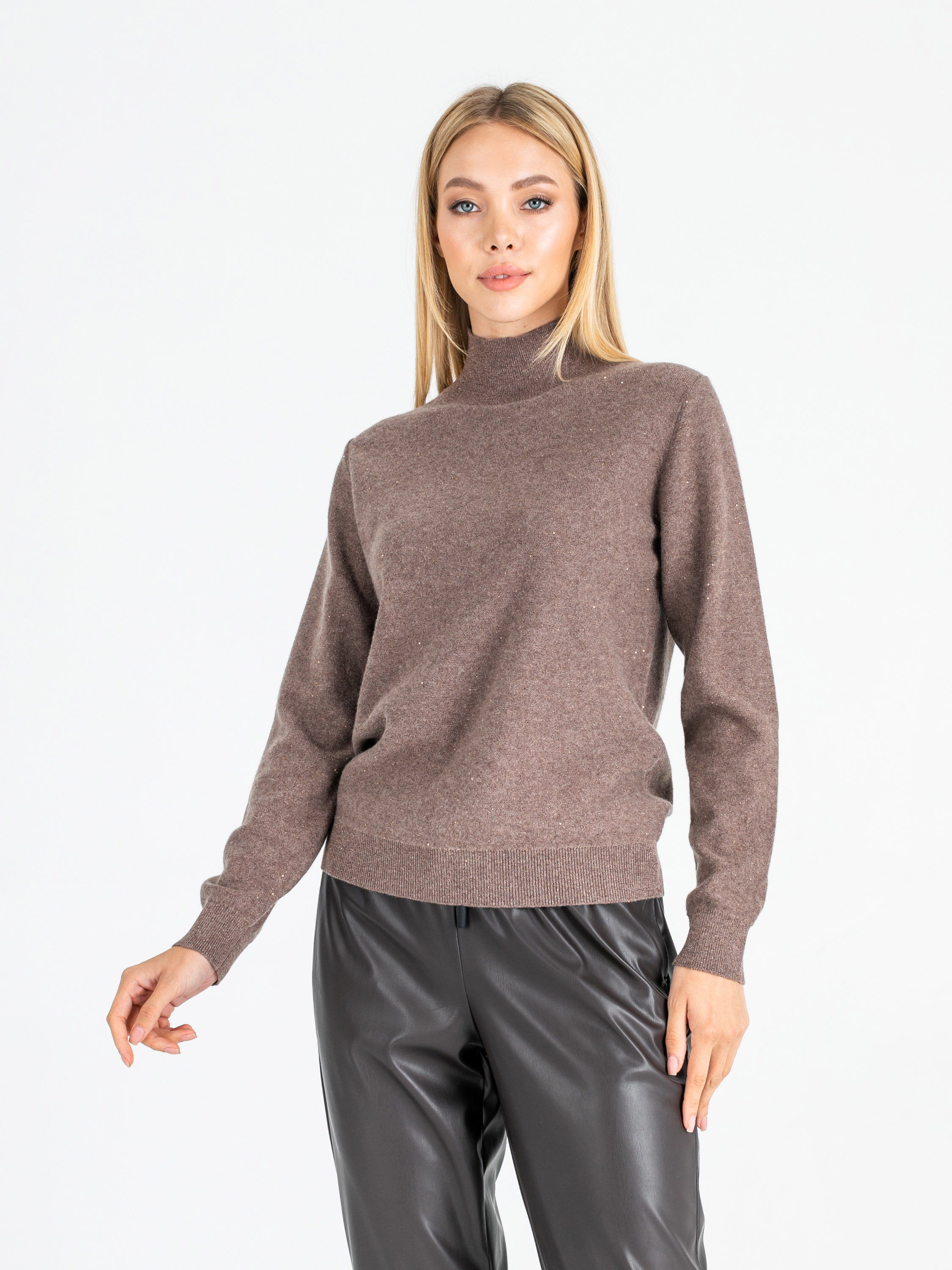 На сайте указаны Российские размеры. Ткань: 98% шерсть мериноса, 2% полиакрил. Крой: базовый однотонный джемпер приталенного силуэта. Модель, напоминающая привычную водолазку, выделяется длинным воротом-резинкой, который защищает от холода и ветра. Универсальная модель из шерсти мериноса – идеальный вариант для зимы и межсезонья. Джемпер представлен в двух стильных цветах – черном и коричневом. Отделка: легкое благородное сияние ткани придают прозрачные пайетки. Базовый компаньон для джинсов, брюк, джемперов, сарафанов, юбок и рубашек. Рост модели - 177 см
