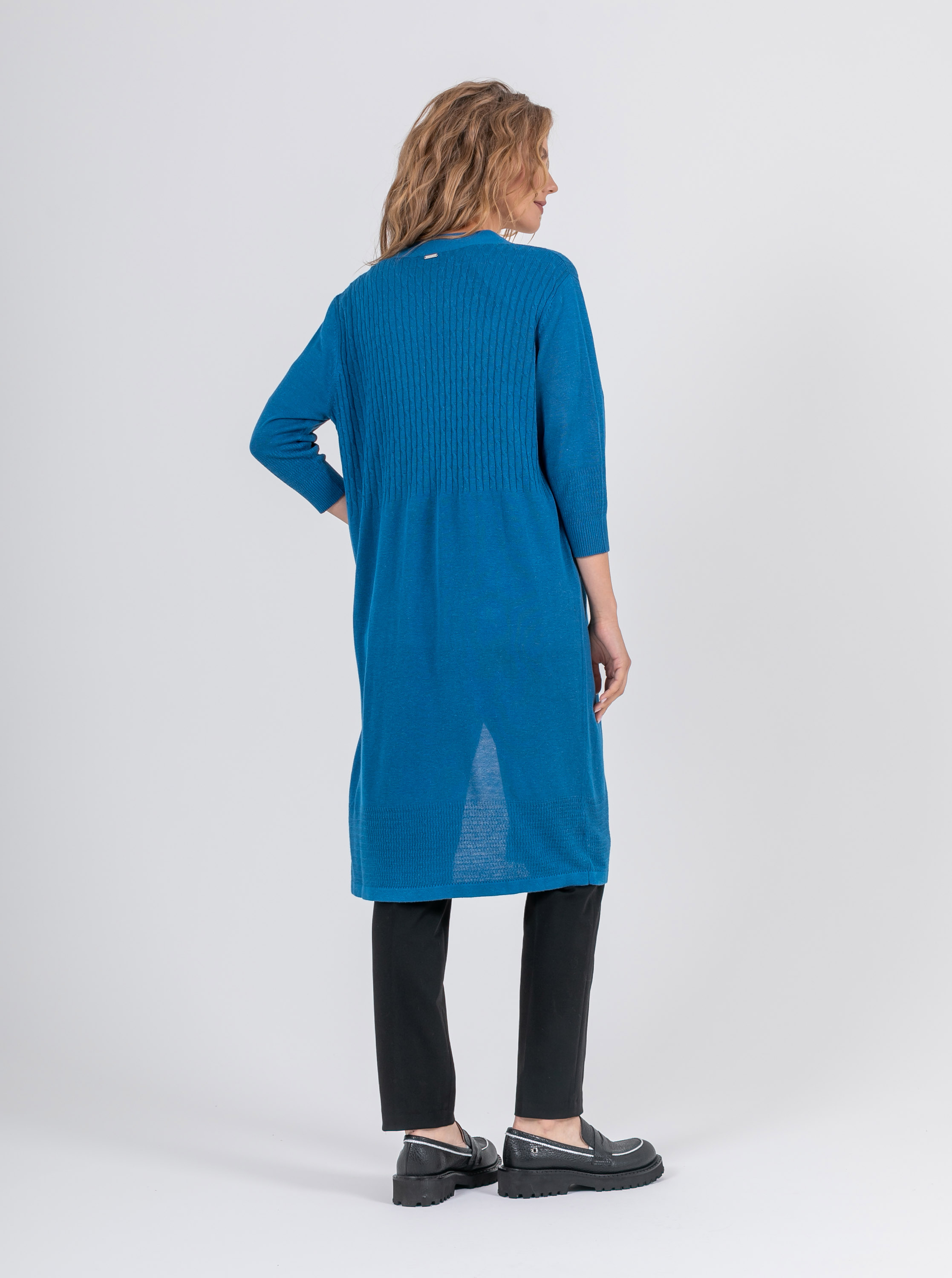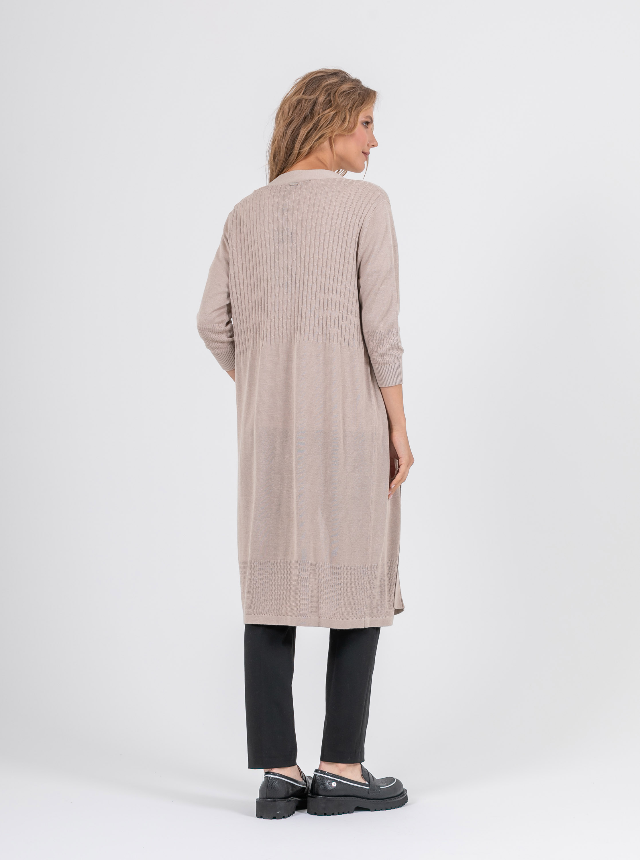 На сайте указаны российские размеры. Ткань: кардиган из мягкой, приятной телу вискозы с добавлением льна. Материал позволяет создавать красивую драпировку. Крой: прямой удлиненный кардиган с рукавом 3/4 создает идеальную вертикаль, визуально удлиняющую силуэт. Функциональный манжет-резинка позволяет поднять и зафиксировать рукав на нужном уровне. Отделка: кардиган имеет два вида отделки – фактуру «косы» в верхней части и на спинке и фактуру «волна» в нижней части изделия. В верхней части спины присутствует фирменный металлический шильдик-эмблема. Кардиган отлично дополняет футболки, рубашки, блузки, а также брюки, юбки и платья из ассортимента Stern. Рост модели 175 см.