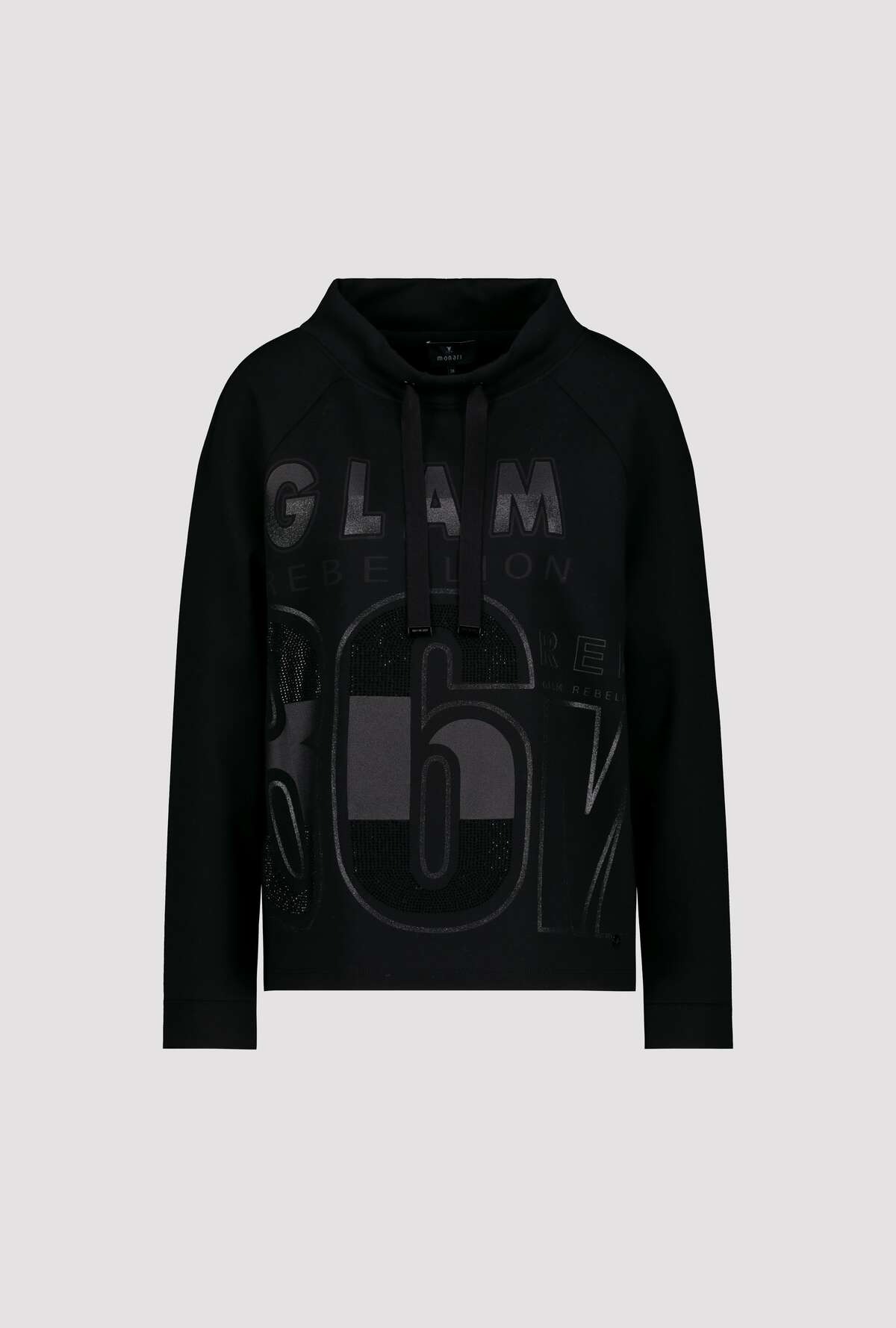 На сайте указаны российские размеры. Толстовка с воротником-стойкой и стразами. В толстовке с длинными рукавами от monari вы почувствуете удобную посадку. Благодаря красивой надписи с эффектными деталями из сверкающих стразов, блесток и лакового принта спереди модели удается стильно привлекать внимание. Стандартный крой поставляется с воротником-стойкой с кулиской, люверсами и завязками. Модель ростом 178 см.