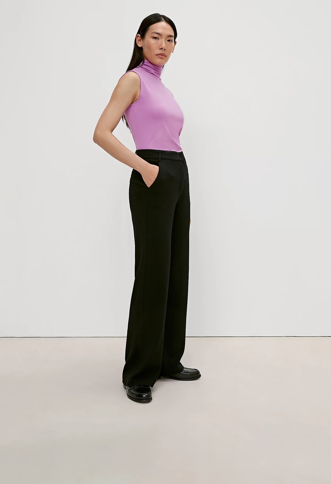 На сайте указаны российские размеры. Приталенный топ без рукавов с воротником-поло. Выполнен из эластичной мягкой ткани. Длина спины: 60 см в размере 42.