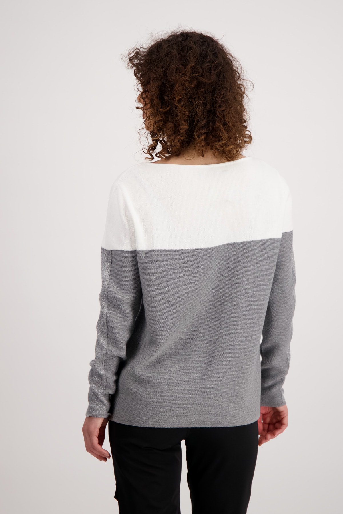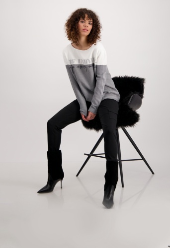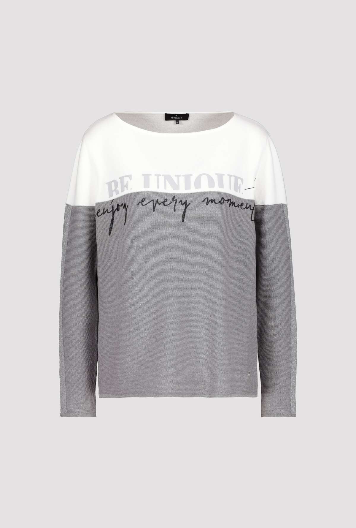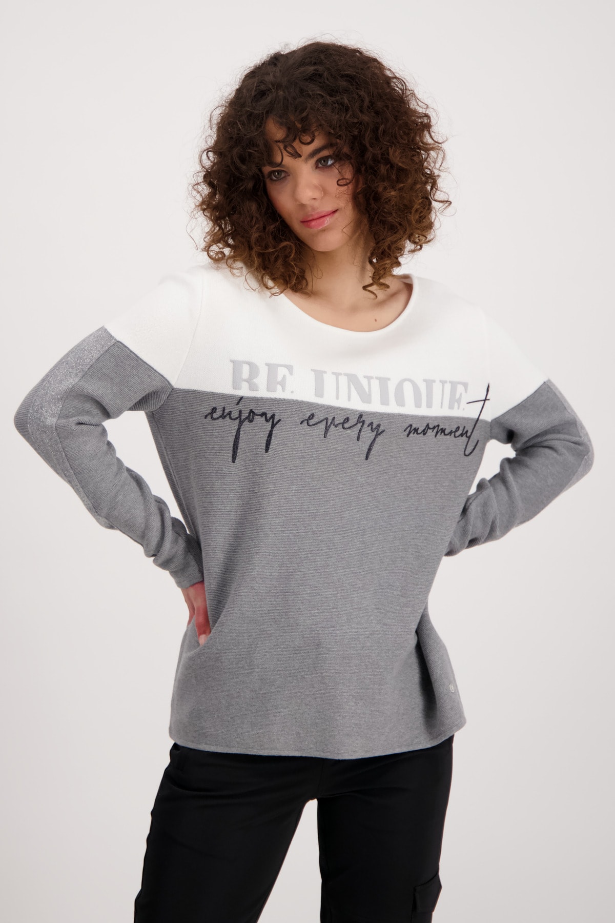 На сайте указаны российские размеры. Вязаный свитер в стиле колор-блок с длинными рукавами и принтом. Благодаря прямой форме с круглым вырезом обещается удобная посадка. Обработка высококачественного хлопка также способствует удобству ношения. Структура изнаночной вязки прерывается дизайном с цветовыми блоками и вставками лицевой глади с блестящим люрексом вдоль рукавов. Спереди видны 3D-резиновые надписи и гламурные 3D-надписи с блестками. Модель ростом 174 см Длина спины 44 размера 64 см.