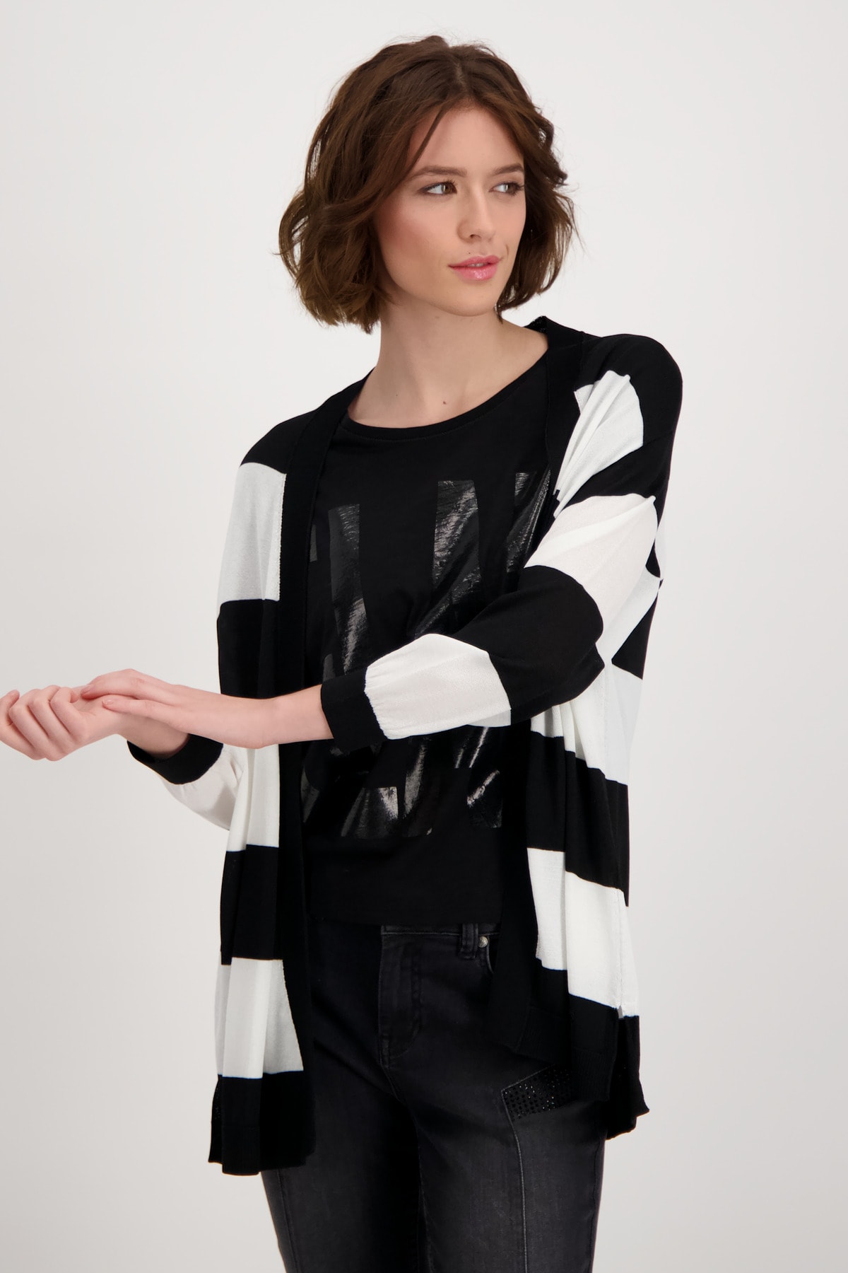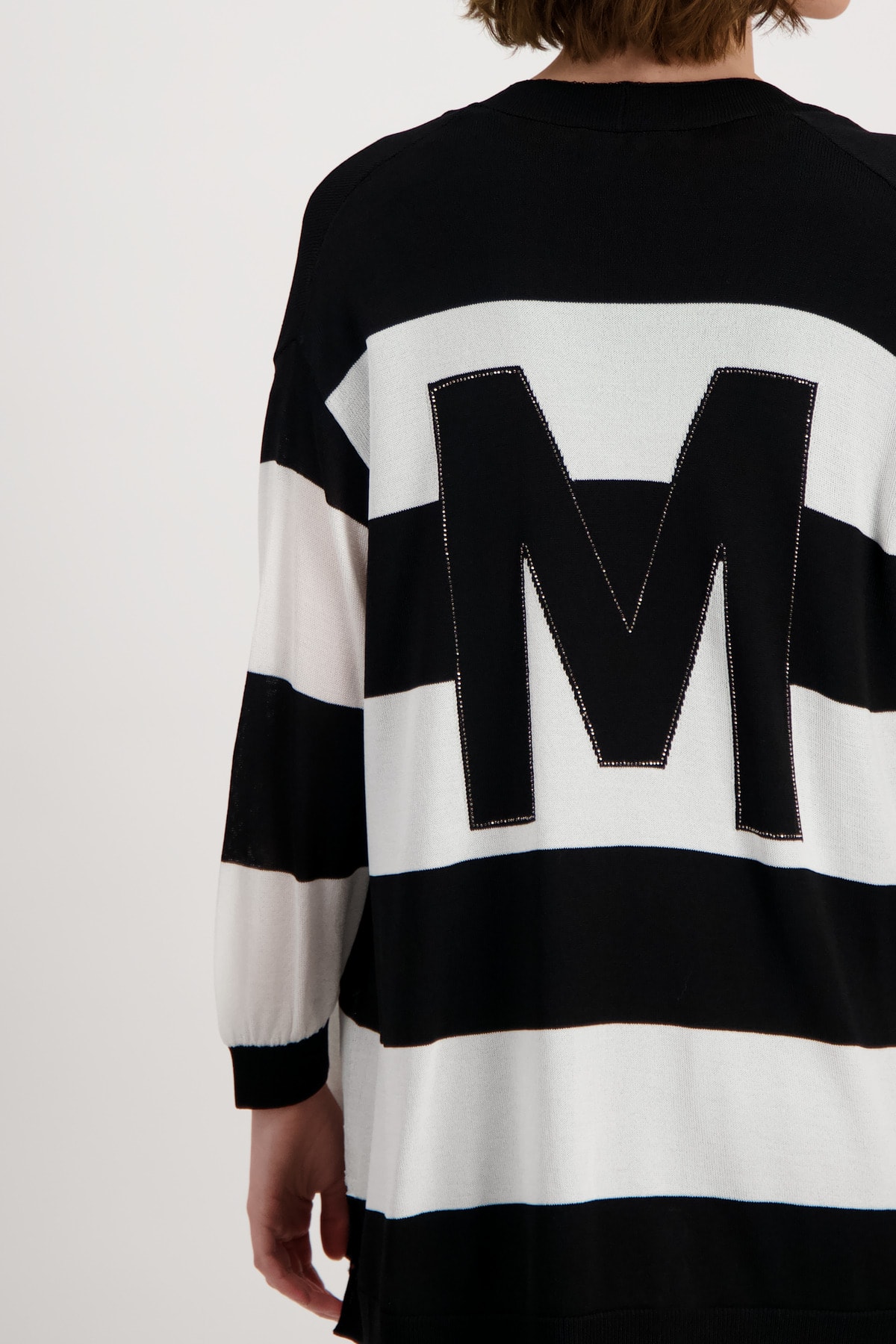 На сайте указаны российские размеры. Открытый кардиган с рукавом 3/4 и деталью на спине. Кардиган с открытым передом придает вашему образу великолепный вид и идеально подходит для комбинирования. Прямой фасон дополнен манжетами и рюшами на концах рукавов, боковыми разрезами и низом с манжетами в резинку. Вывязанная буква со сверкающими стразами украшает спину модели, украшенной полосками по всей поверхности. Струящаяся вискоза в смеси также обеспечивает удобную посадку. Побалуйте себя. Модель ростом 178 см Длина спины 72 см.