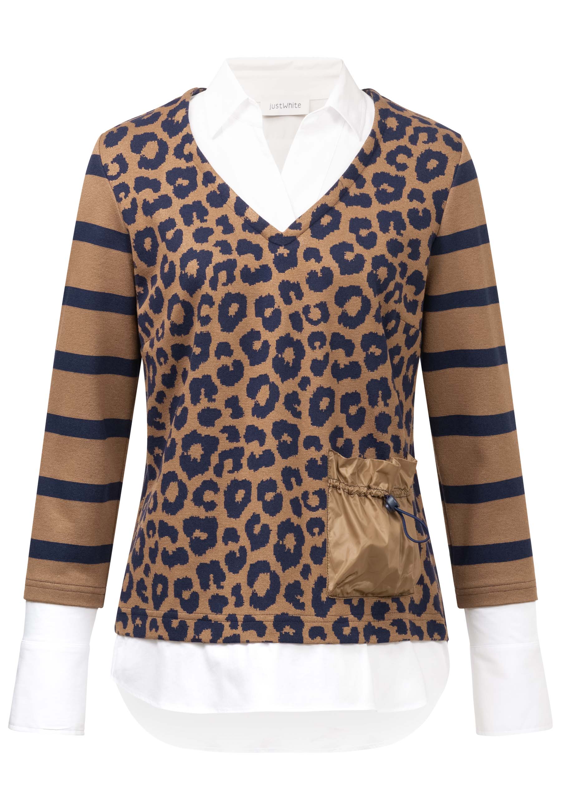 На сайте указаны российские размеры. Свитер с анималистичным принтом и блузочной вставкой. Несложная модель «два в одном» для модного стиля. Будь то в офисе для модного делового образа или для непринужденного повседневного образа в повседневной жизни - с этой модной вещью вы всегда будете одеты идеально. Блузочная вставка с воротником-стойкой, широкие манжеты с прорезями и удлиненный низ сзади придают пуловеру небрежно-шикарный вид. Наша модель ростом 177 см. Измерения для 44 размера: Окружность груди: 104 см Талия: 101 см Ширина бедер: 110 см Длина спинки: 70 см. Длина рукава: 62 см.